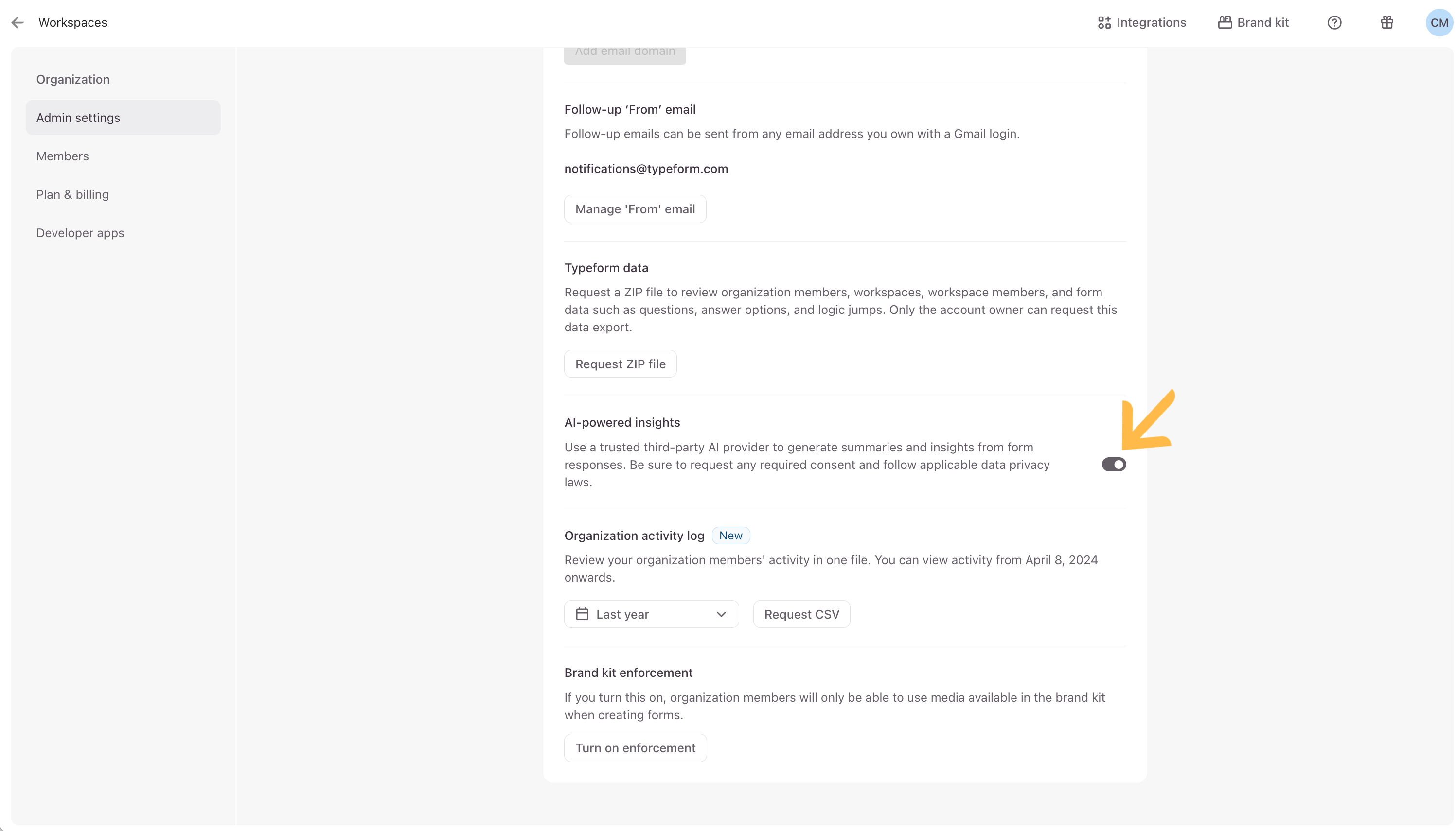 - Enterprise and Growth Custom plans: You'll see an AI-Powered Insights toggle in your Admin settings, which is turned off by default. Turn it on to access Smart Insights. This setting will apply to all forms and workspaces within your organization.