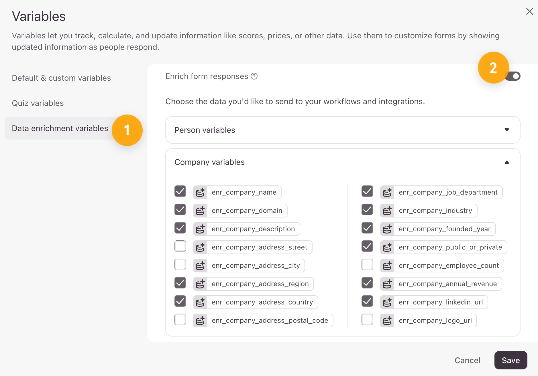 Person variables contain enrichment data about the respondent, while Company variables contain enrichment data about the company they work for.