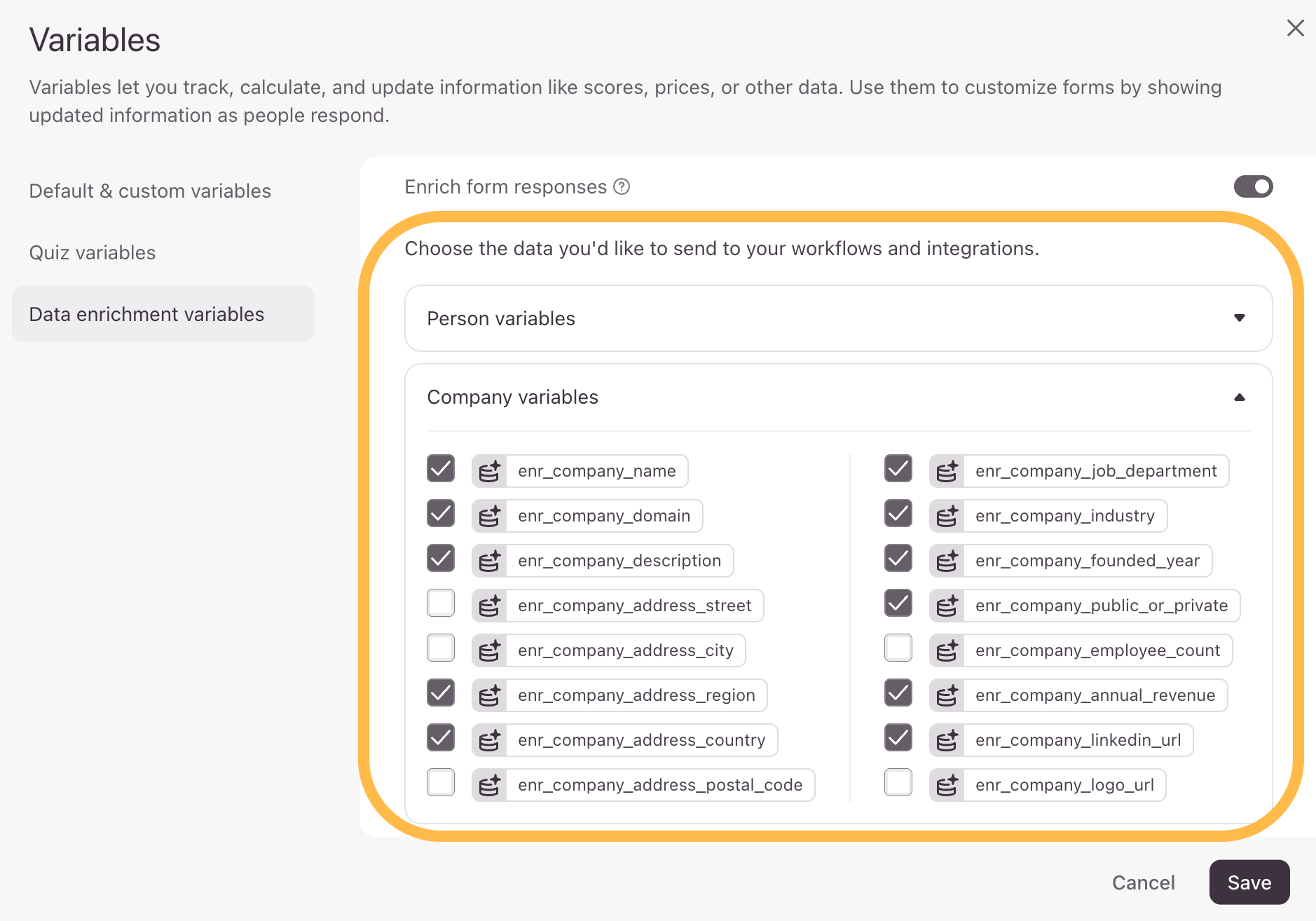 All enrichment variables are automatically selected when Enrich form responses is turned on. Deselect any enrichment variables you don't need.