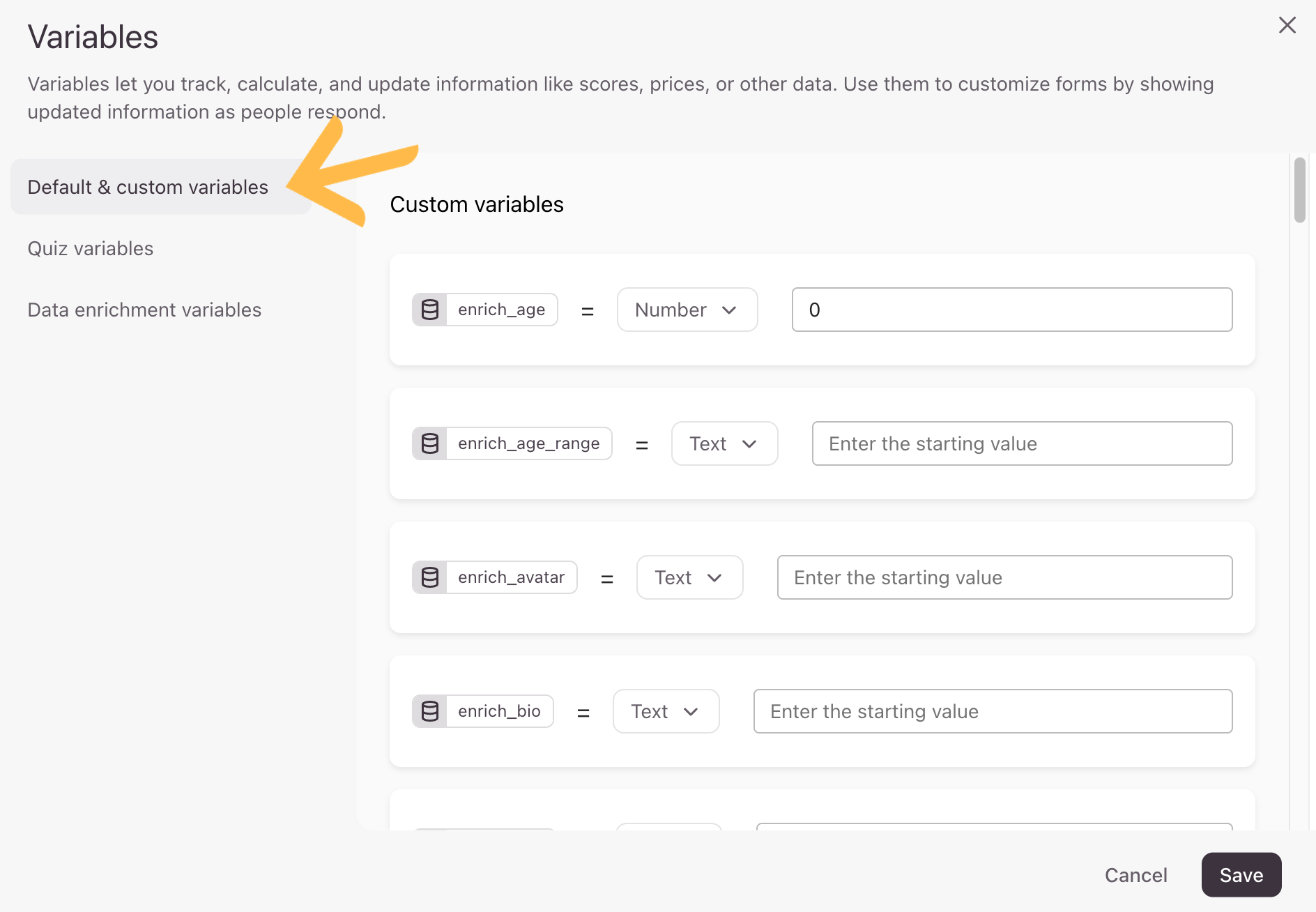Note! If you have a form that was created with Response enrichment before April 21, 2026, it will now collect Response enrichment data for the new variables listed in the chart above. Legacy enrichment variables (on forms created before April 21, 2026) will no longer be enriched. Legacy enrichment variables can be found in the Default & custom variables section of Variables.