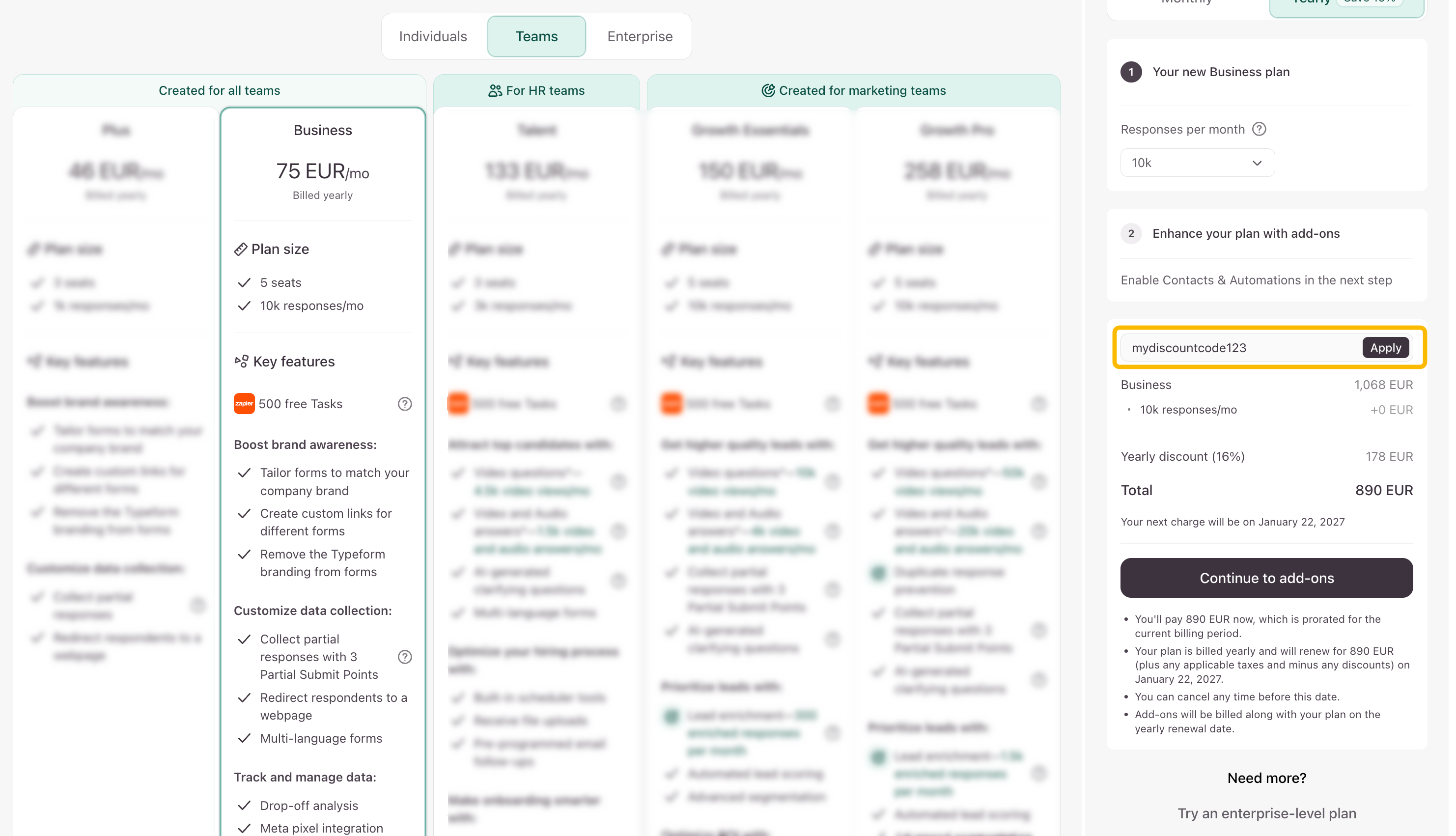 If you have a discount coupon for Typeform, this article shows you how to apply it when signing up or changing your Typeform plan.