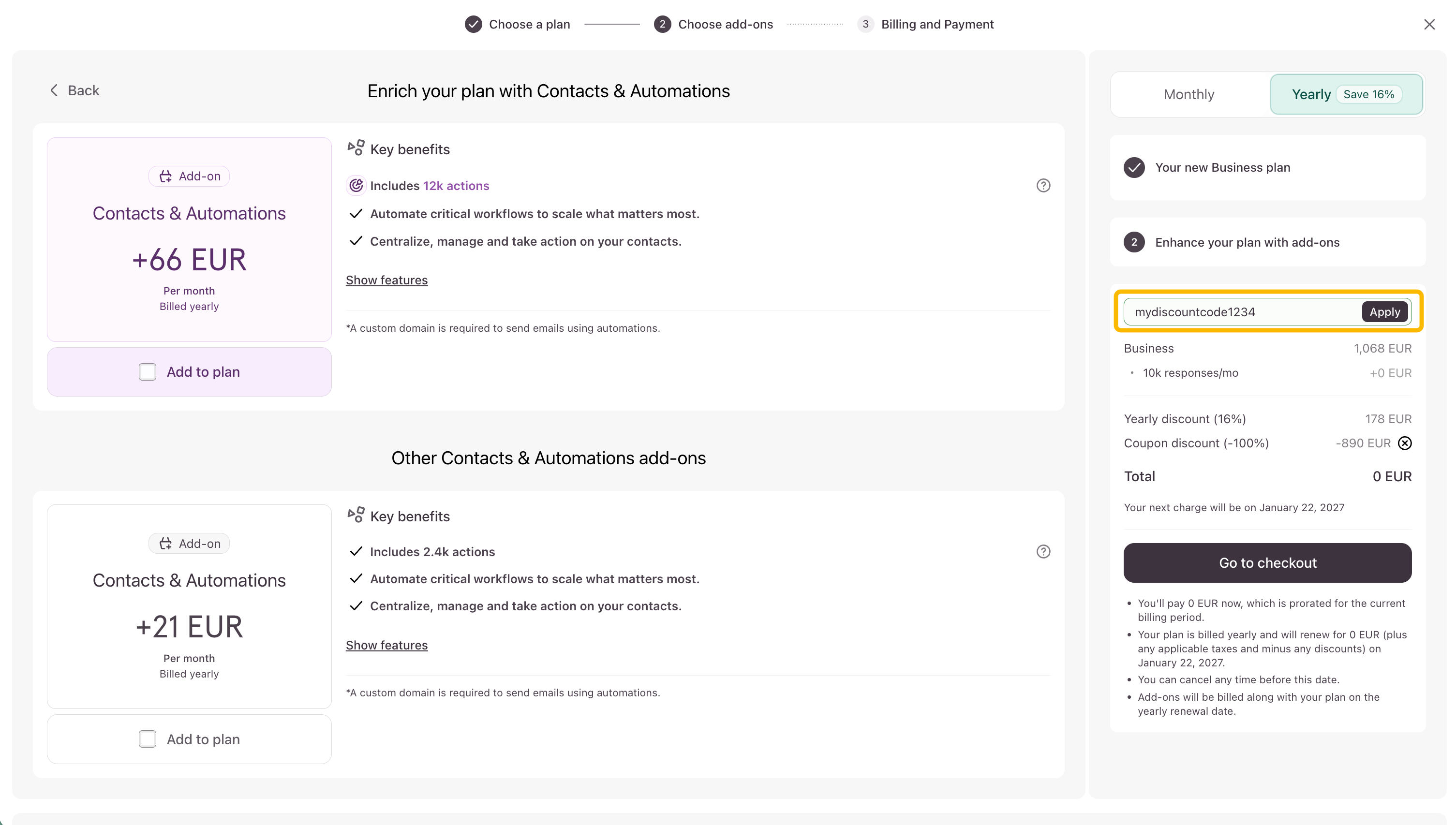 5. Click Continue to add-ons and then Go to checkout to complete the payment and complete the process. If you haven't already added it, you can also add your discount code on either of these pages.