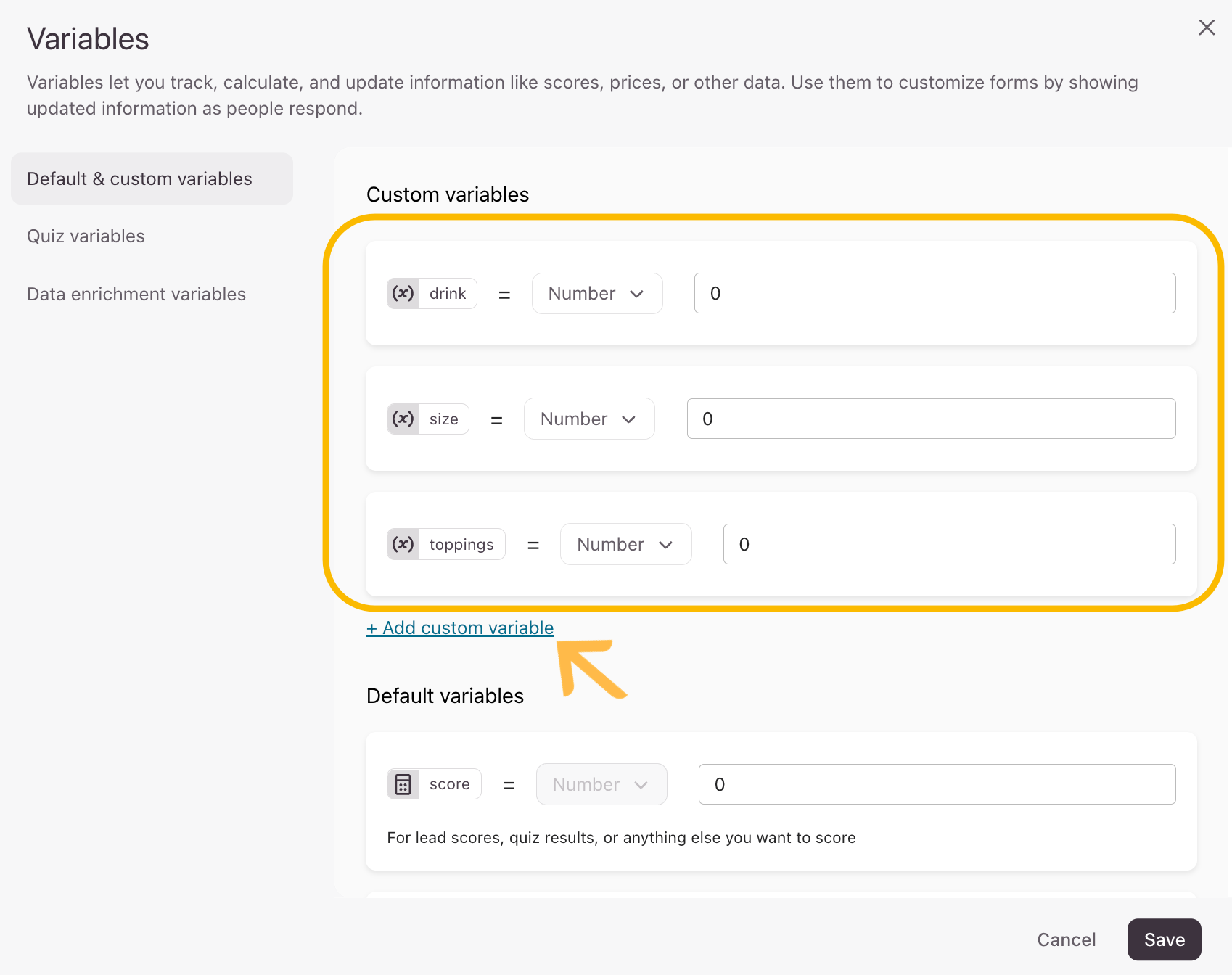 2. Use + Add custom variable to create your own, then hit Save when you’re ready. For this form, we’ll add a custom drink, size, and toppings variable.