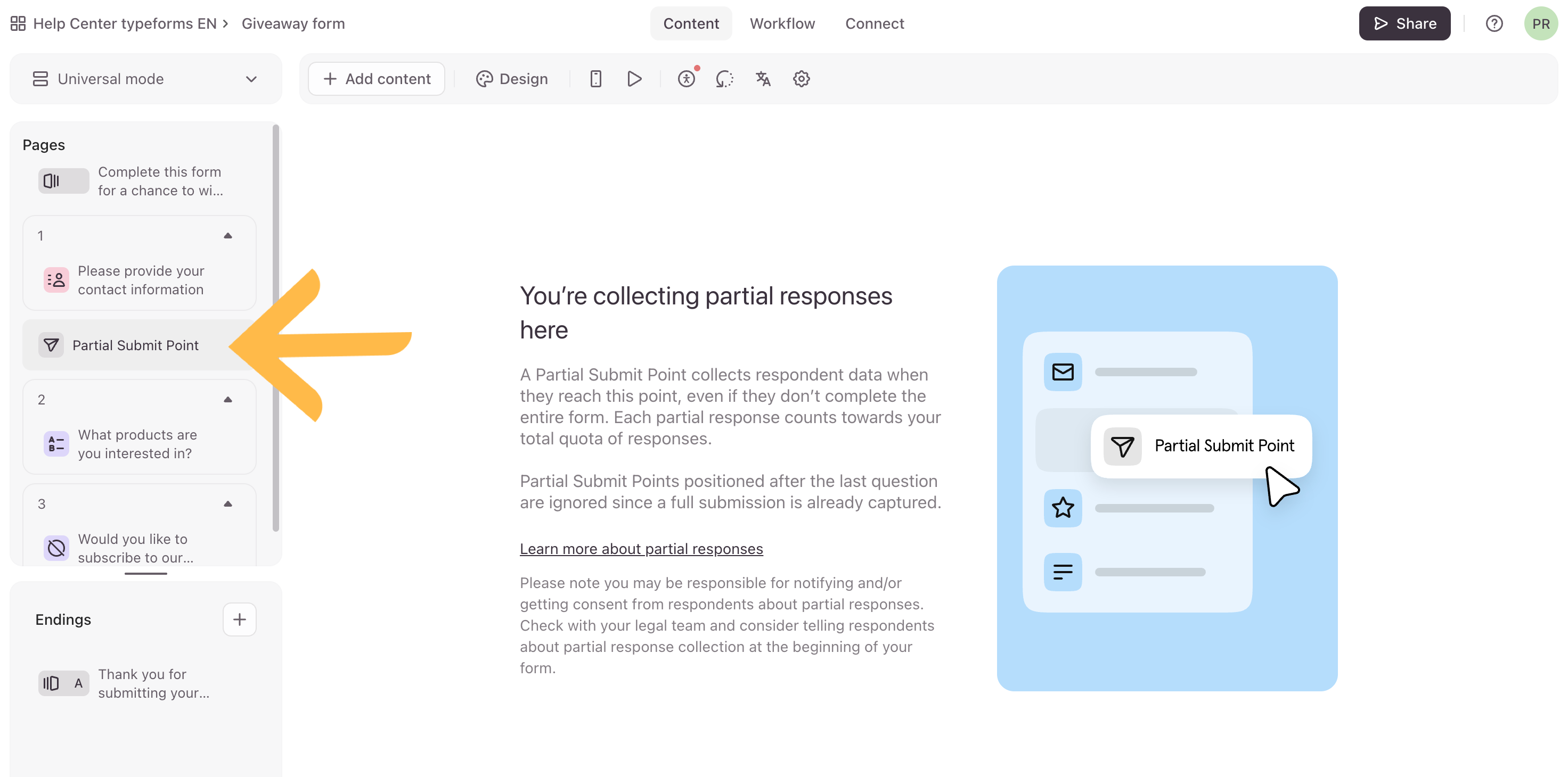 3. We’ll add a Partial Submit Point after the Contact Info question, that way if the respondent fills out the Contact Info question but doesn’t complete the rest of the form, we’ll still collect their contact information.