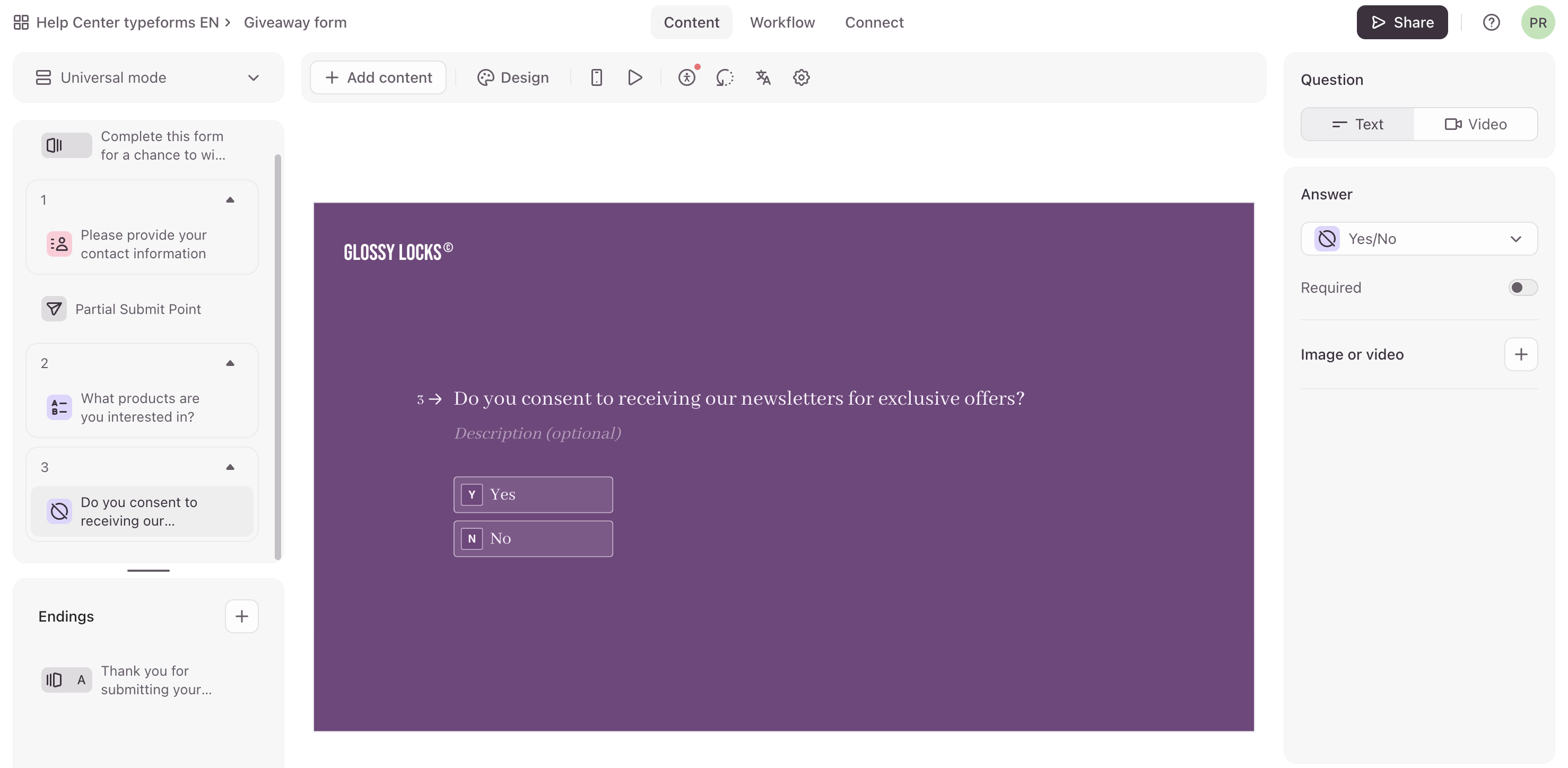 5. We’ll use a Yes/No question asking for consent to receiving newsletters. When you connect the form to an email marketing tool, you can use this question to opt respondents in or out of receiving emails.