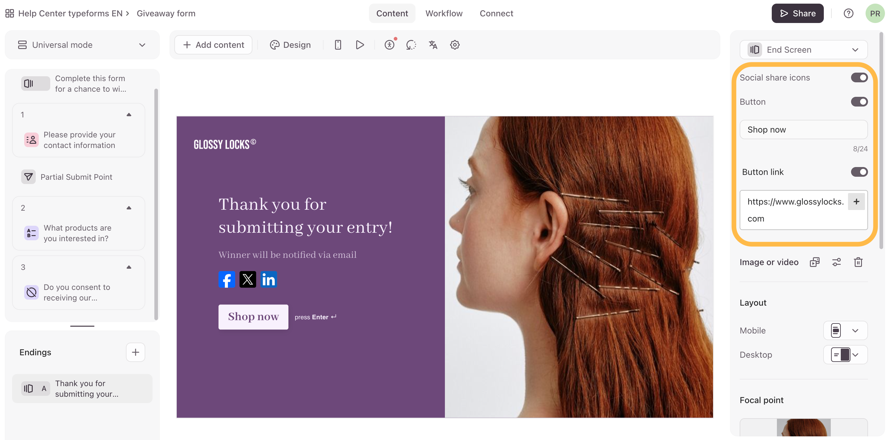 We’ll toggle on Social share icons, so respondents can share the form with others on their social media. We’ll also toggle on Button and change the text to Shop now. Toggle on Button link and enter your website or any URL you want respondents to be redirected to when they click the button on the End Screen.
