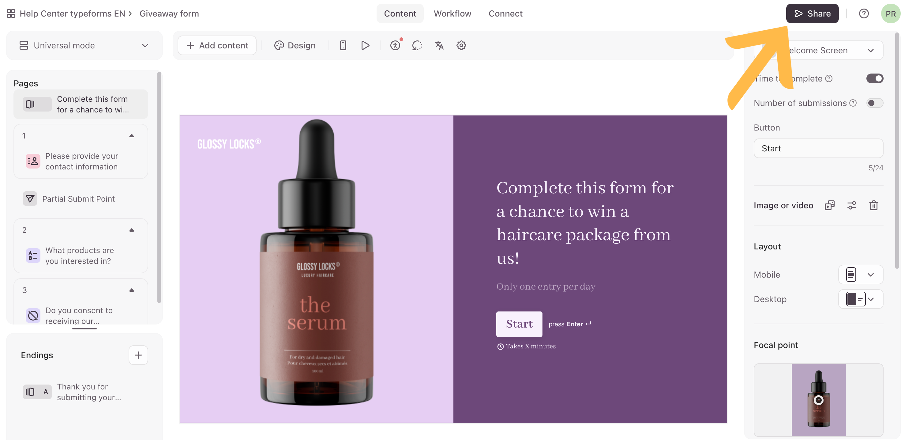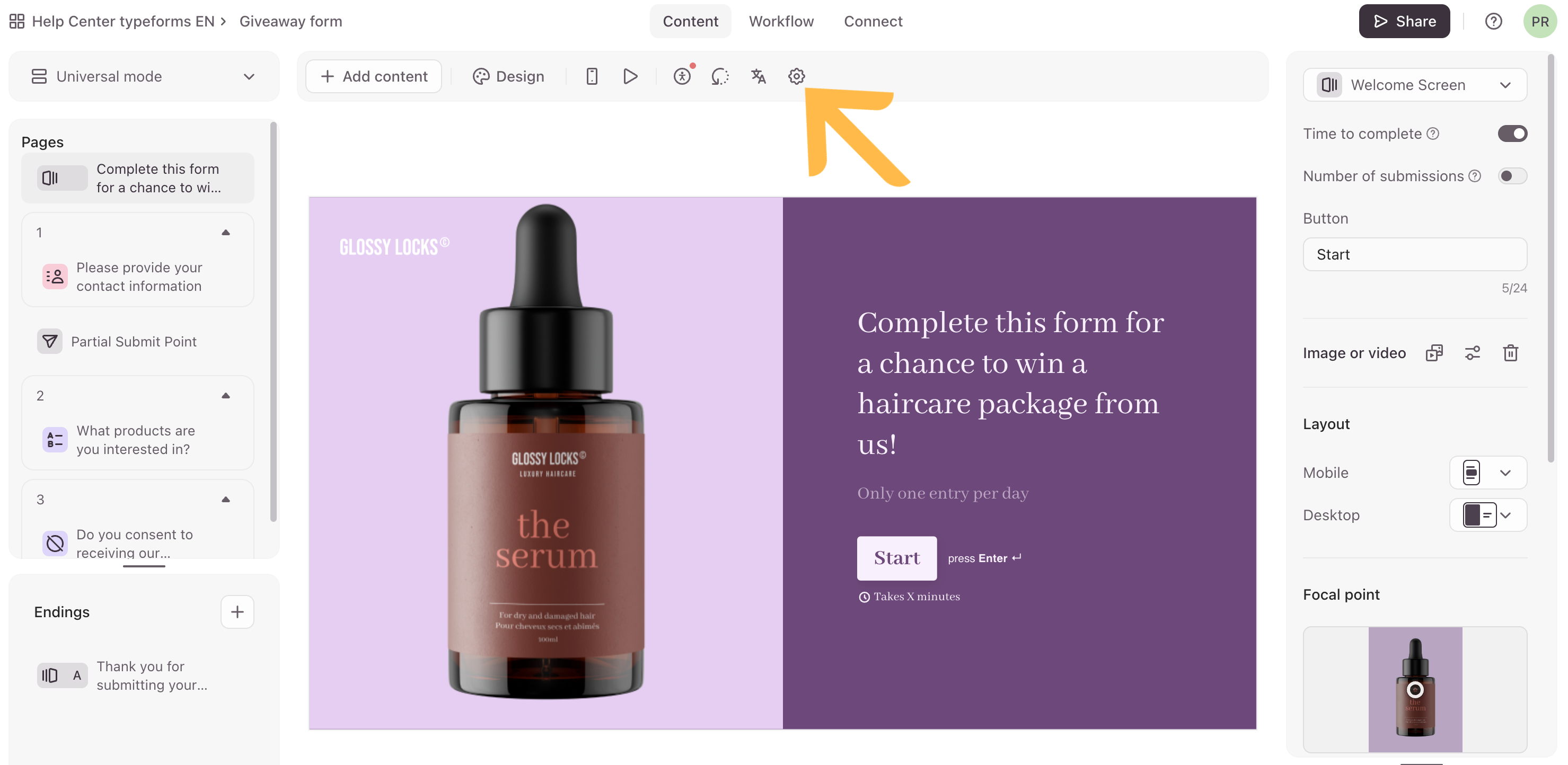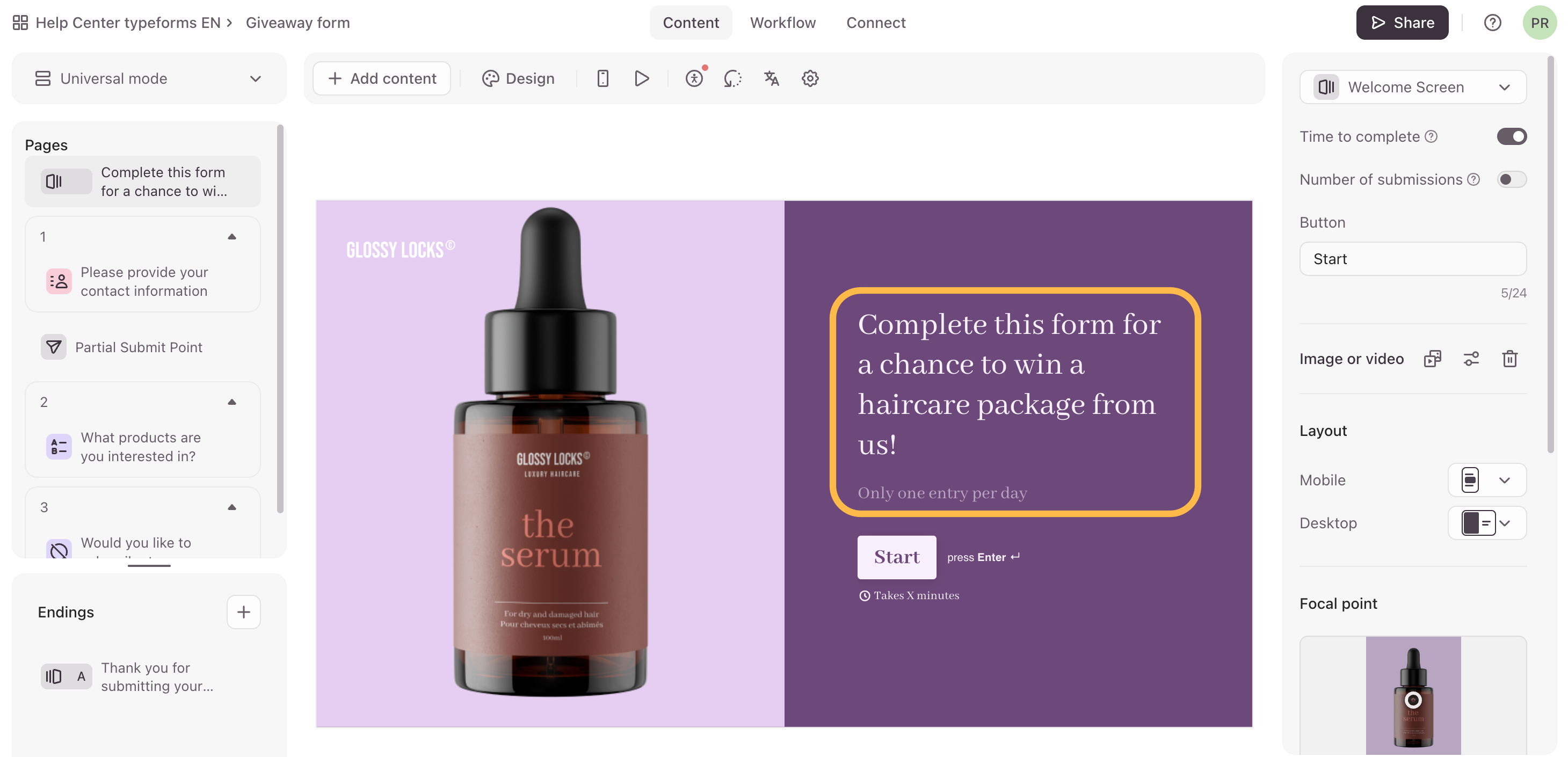 - We’ll start our giveaway form with a Welcome Screen to let respondents know that they’ll have a chance to win something.
