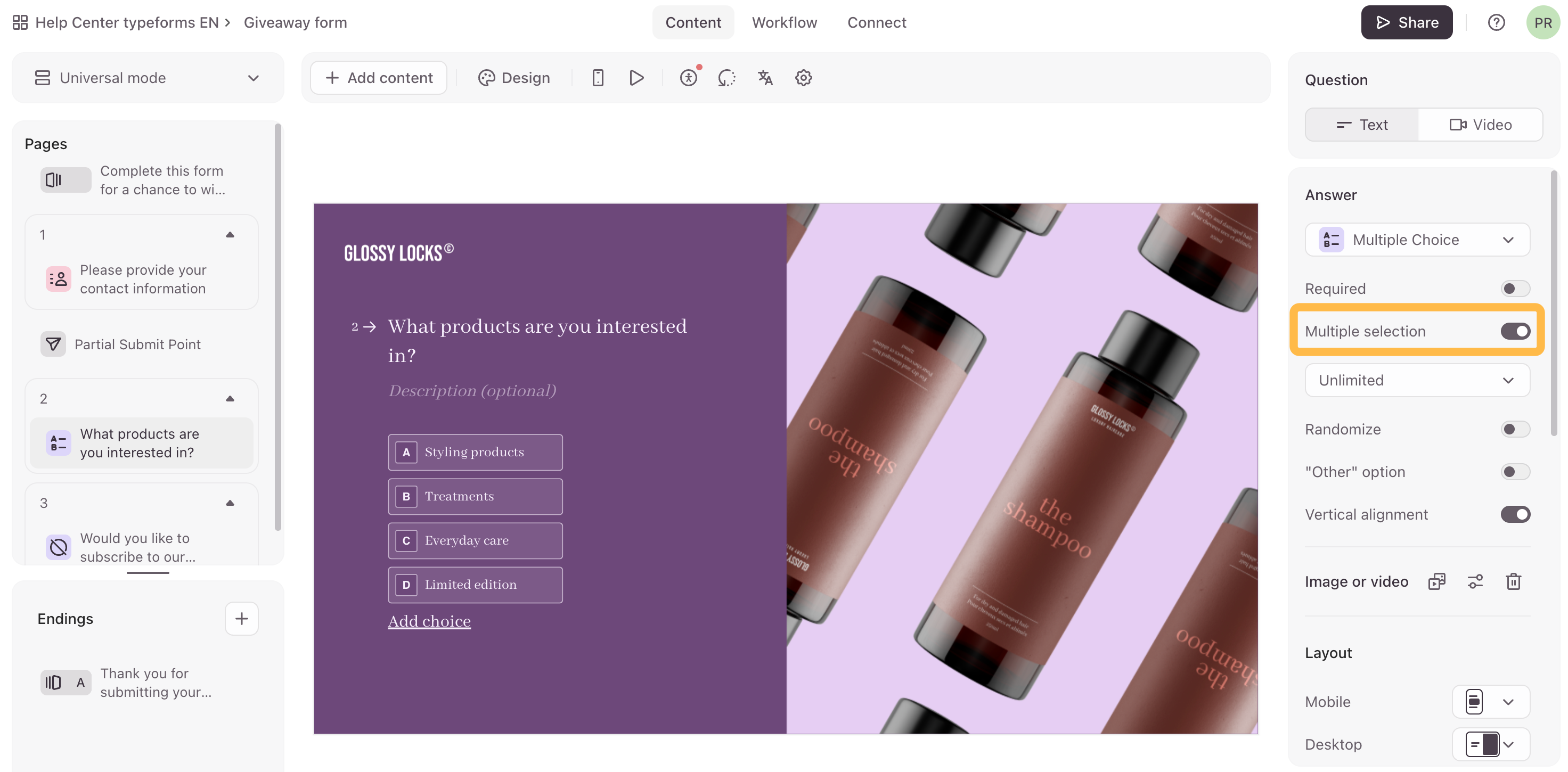 4. We’ll add a Multiple Choice question next that asks what products they're interested in and we can then tailor marketing emails to what they’re looking for. We’ll toggle on Multiple selection to let respondents select more than one answer.