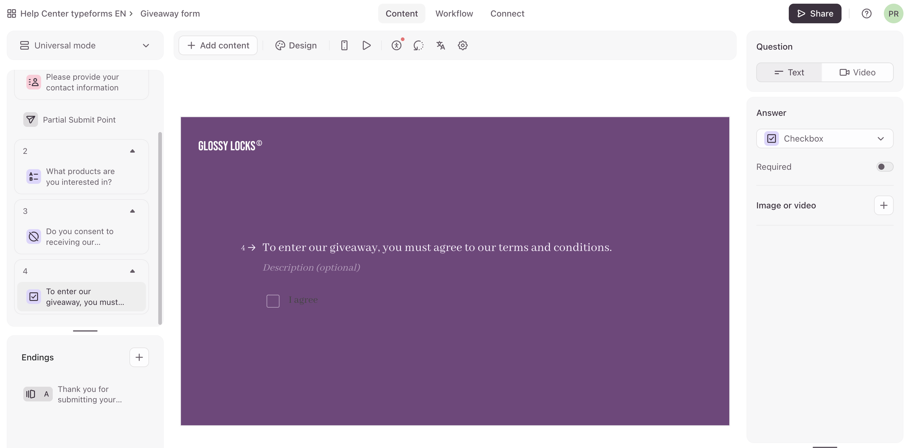 6. Next, we'll add a Checkbox question asking respondents to agree to our terms & conditions.
