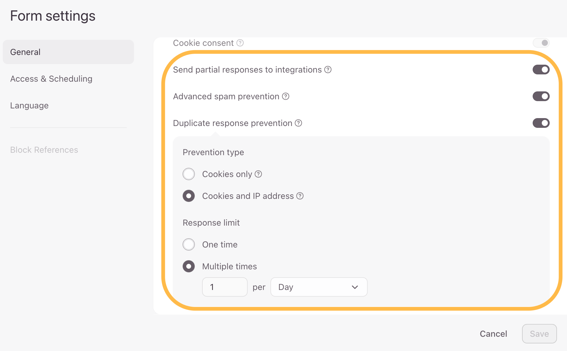 Adjust the settings of your form by clicking the Settings icon in the tool bar of the Content panel. You can add settings such as sending partial responses to integrations, spam prevention, duplicate response prevention and much more.