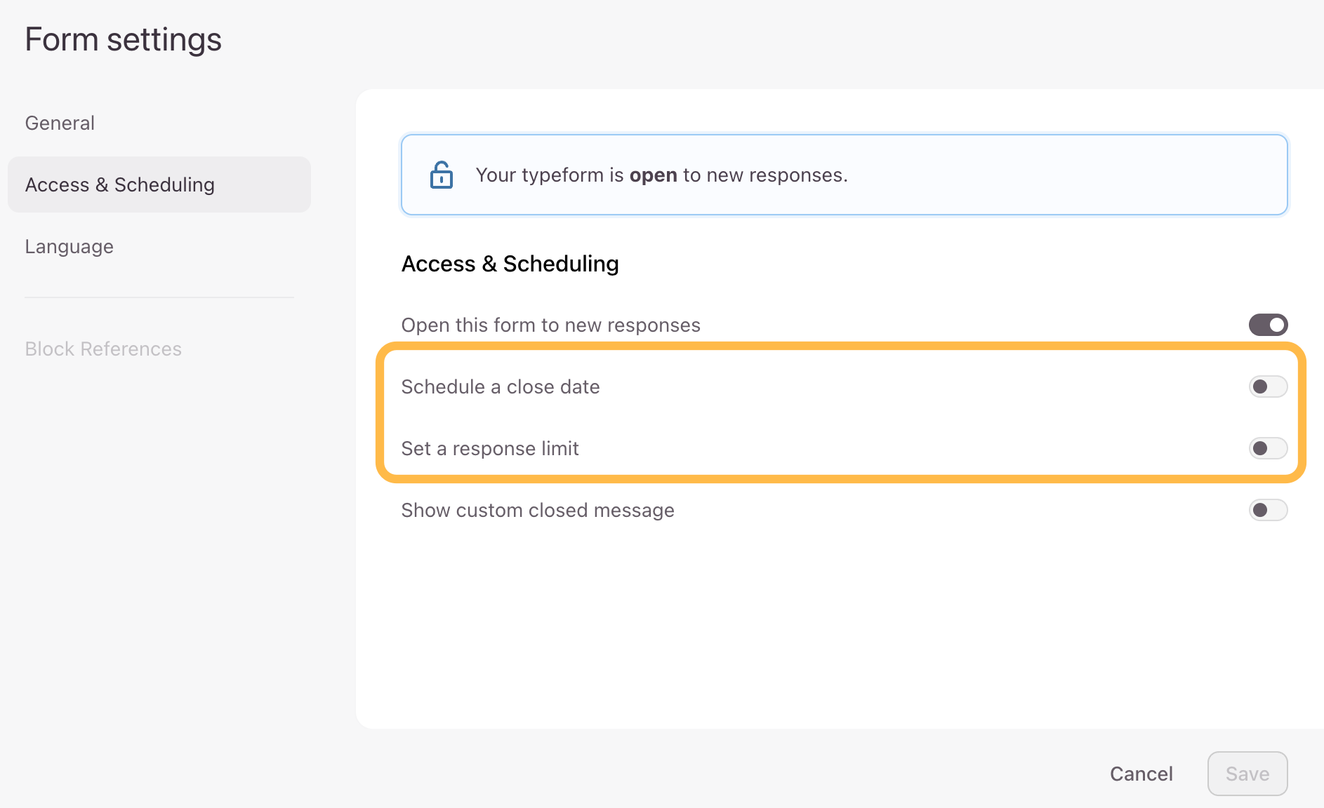You can set a response limit to your form to automatically close it once you’ve hit a certain number of responses, or you can schedule a close date. You can find these settings under Access & Scheduling. More information can be found here.