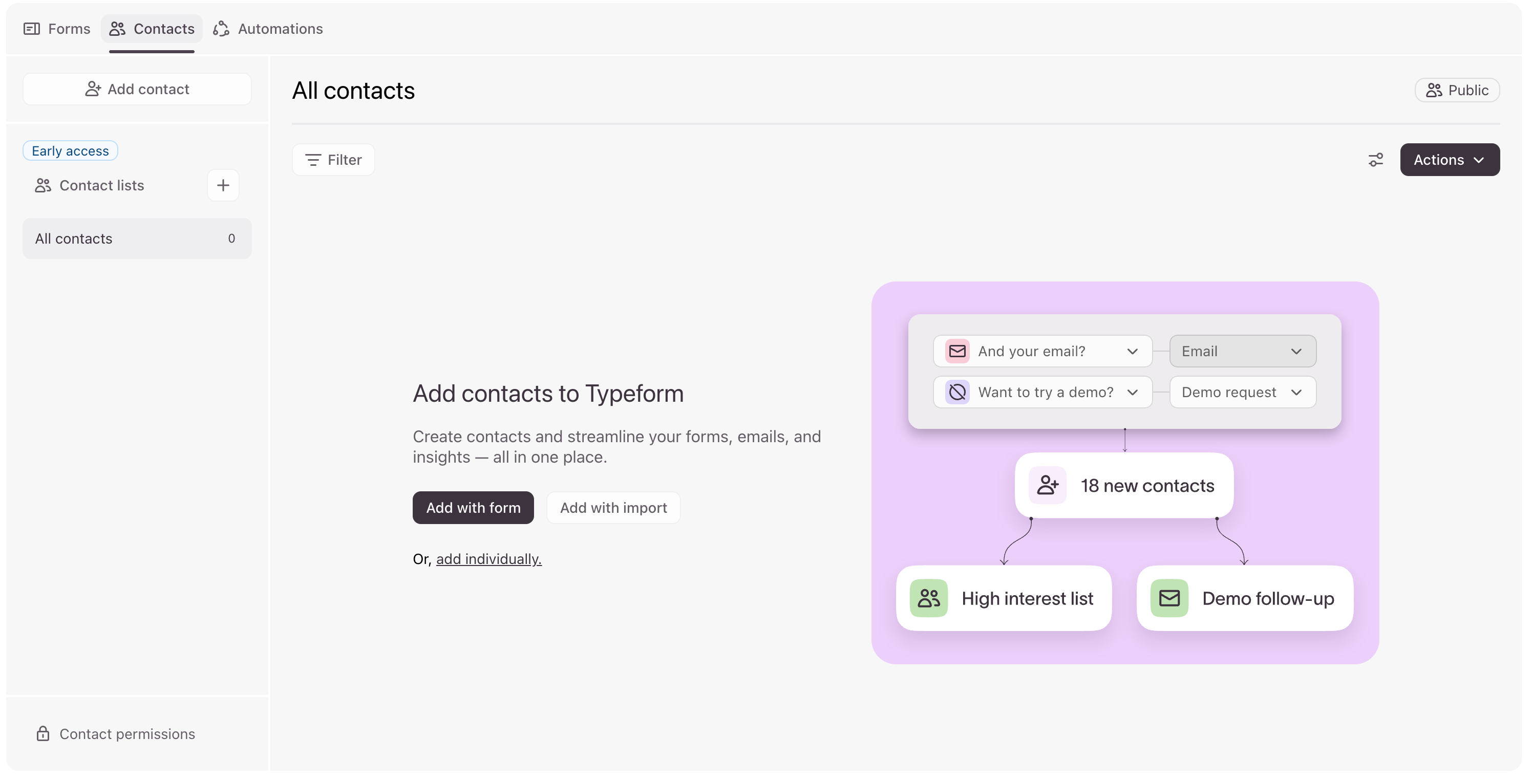 You can create new contacts and update existing ones, manage and create contact properties, and map these properties to questions in your forms in the Contacts tab of your account.