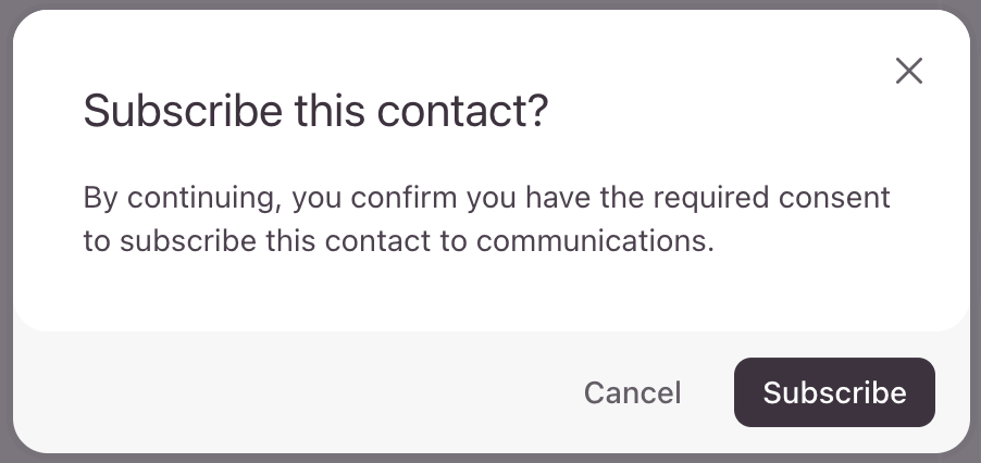 8. If you’ve selected Subscribed as your Contact’s Subscription status, you’ll also see a message asking you to confirm that you’ve received consent from your Contact. Click Subscribe if you’ve obtained their consent.