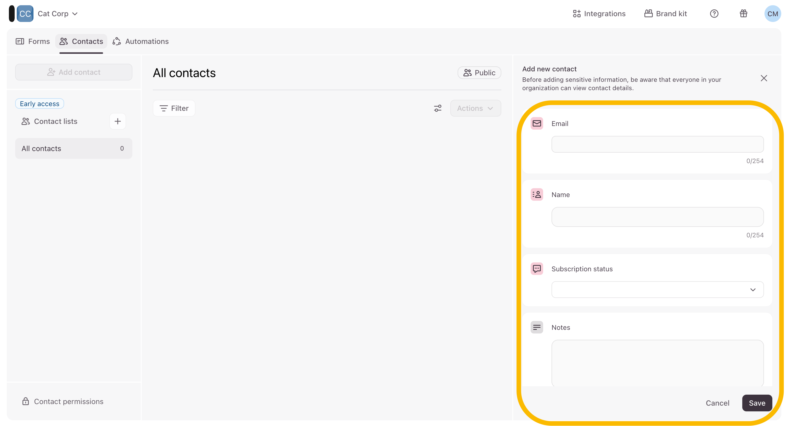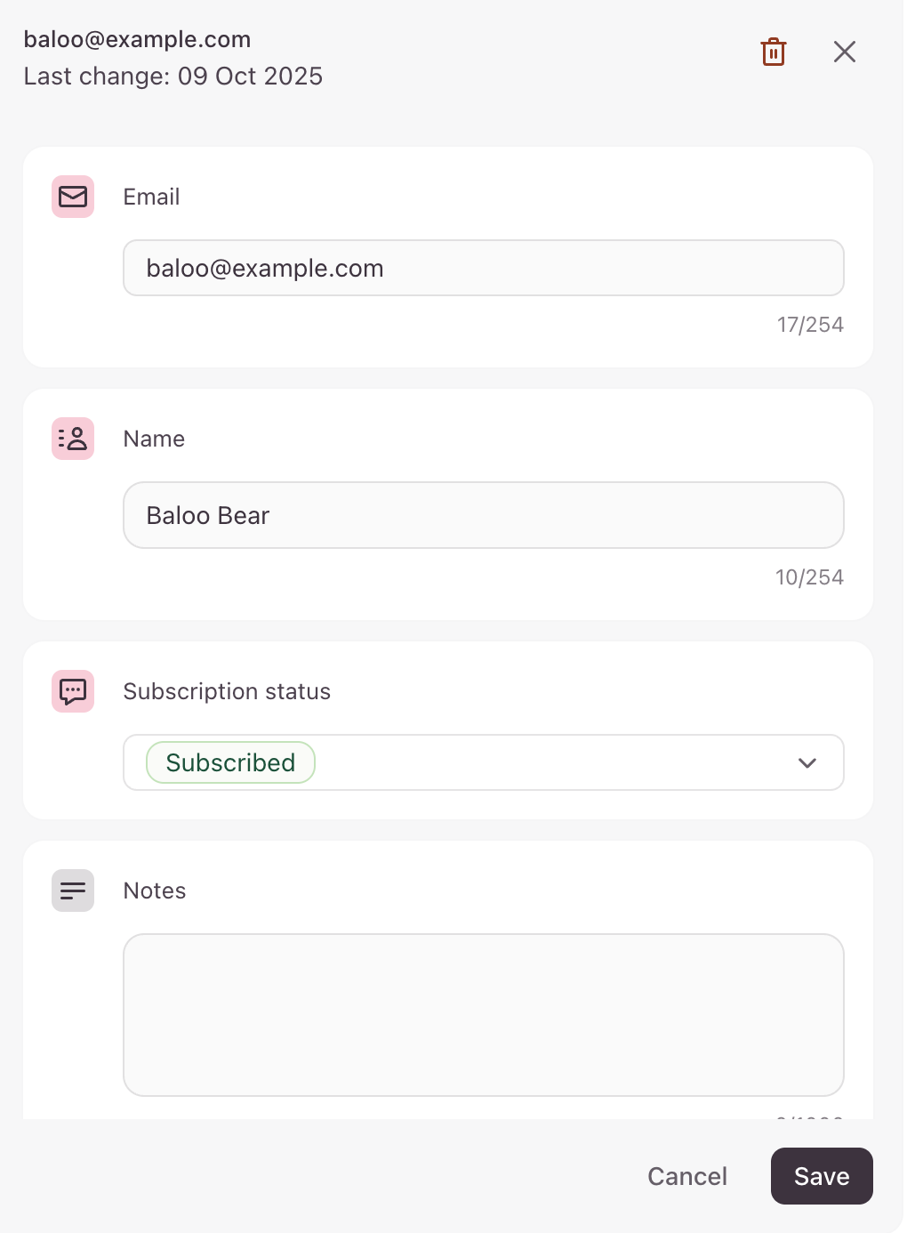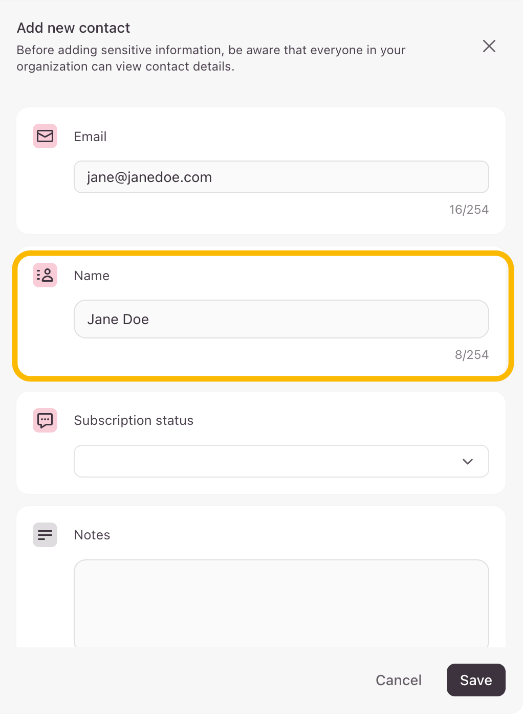 3. If you've selected to add contacts individually, you’ll see some default Contact properties including Email and Name. You can manually enter the contact information you need here. You can also add Subscription status and include some notes about the contact. Your notes can be up to 1,000 characters.