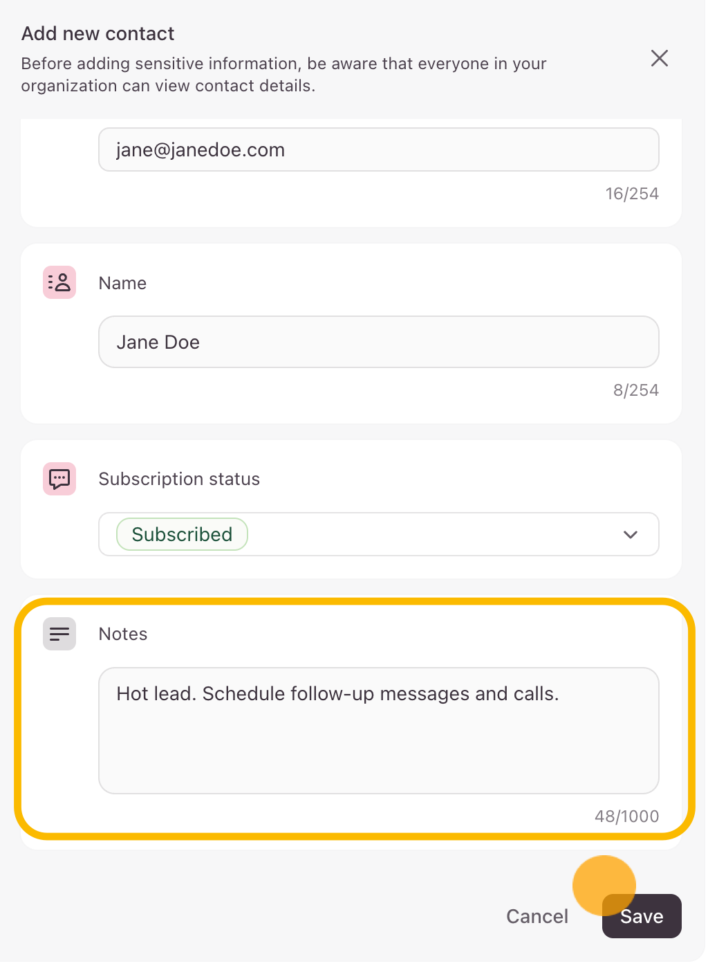 7. Add some notes about your contact if you like (up to 1,000 characters). Click Save when you’re done creating your new contact.