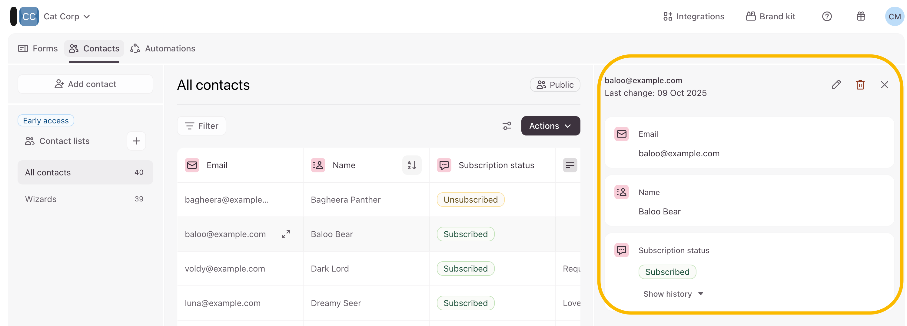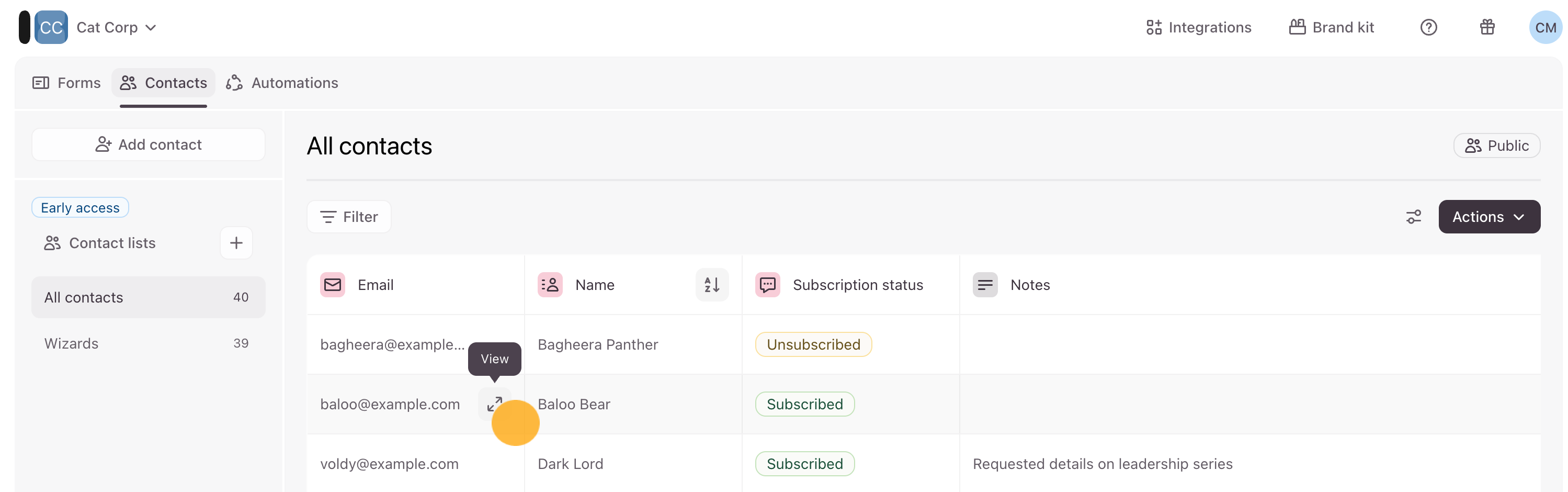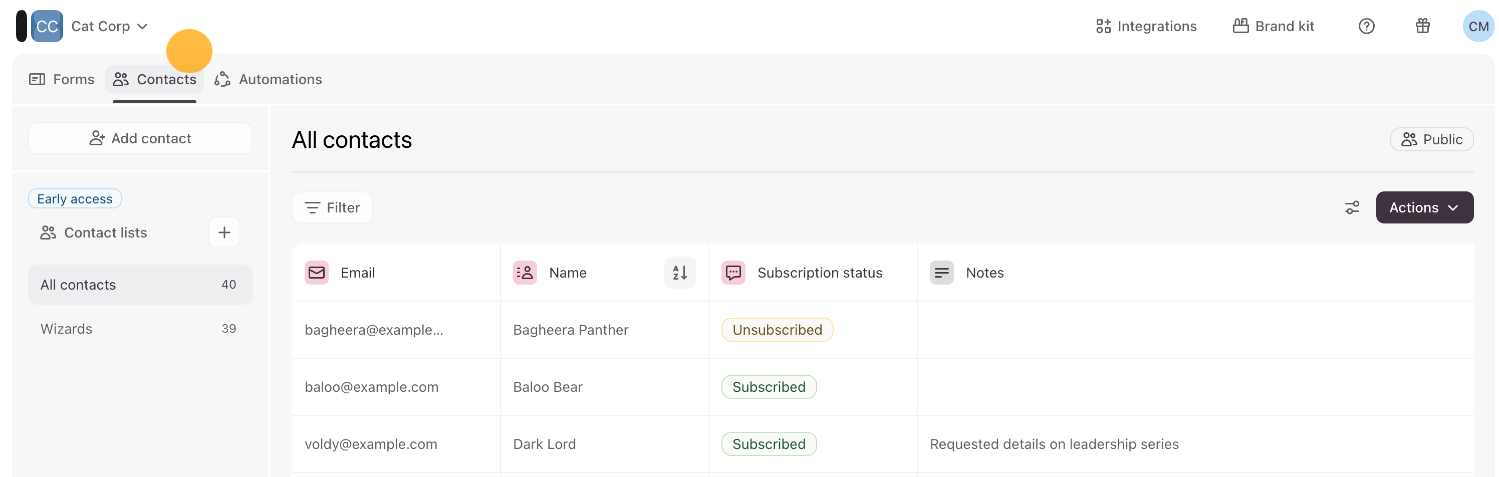 You can create new contacts and update existing ones in the Contacts tab of your account. Contacts can be added through form submissions, imported from an external CSV file, or added individually.