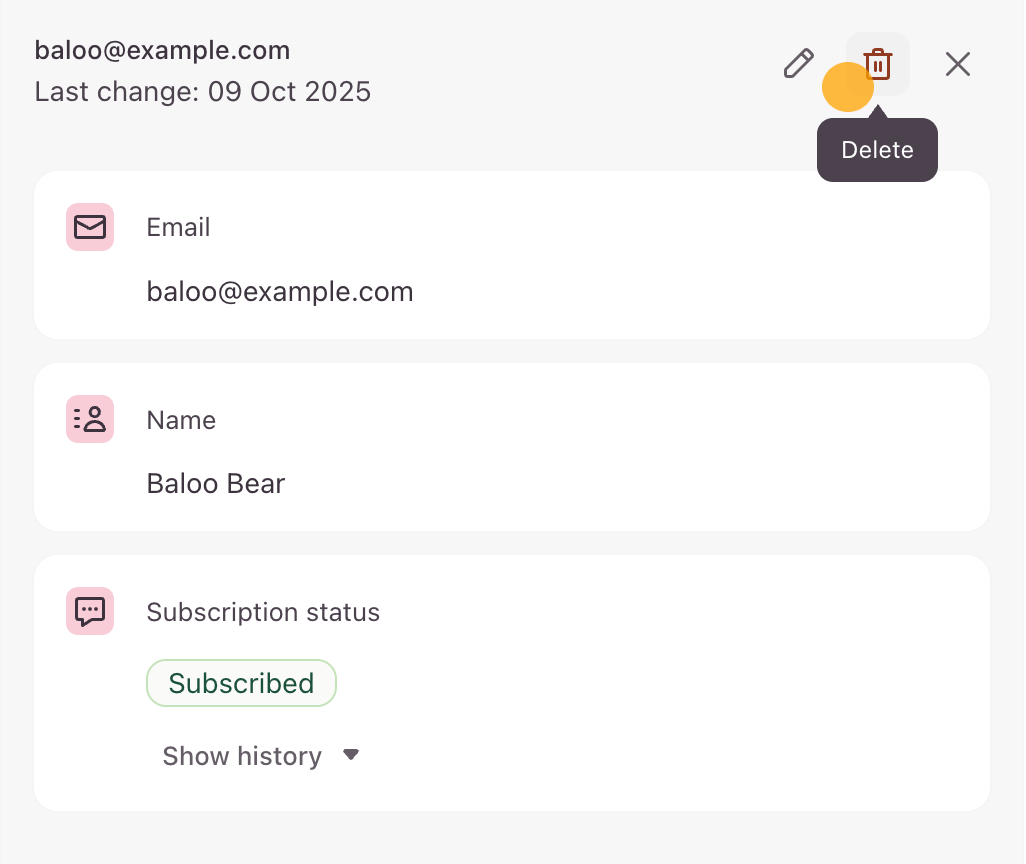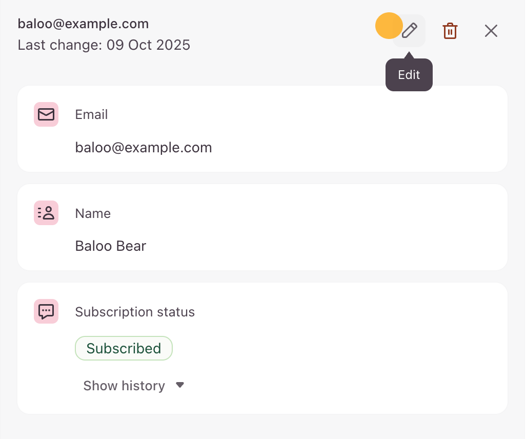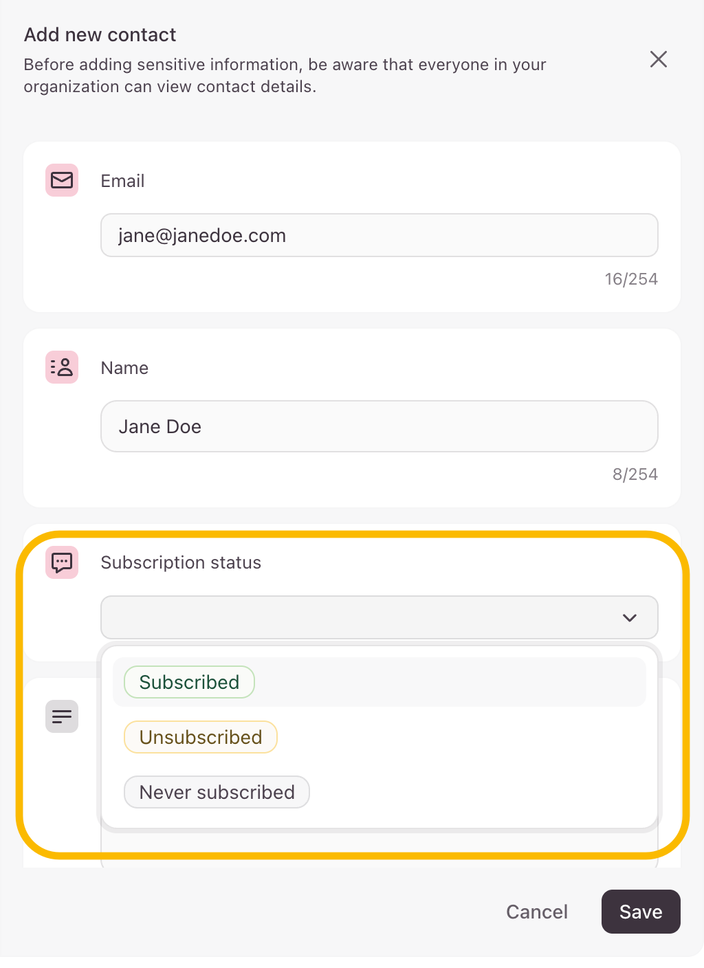 6. Select your Contact's Subscription status from the dropdown list. To make sure you’re compliant with legal requirements, ask your Contacts for their consent before subscribing them to communications.