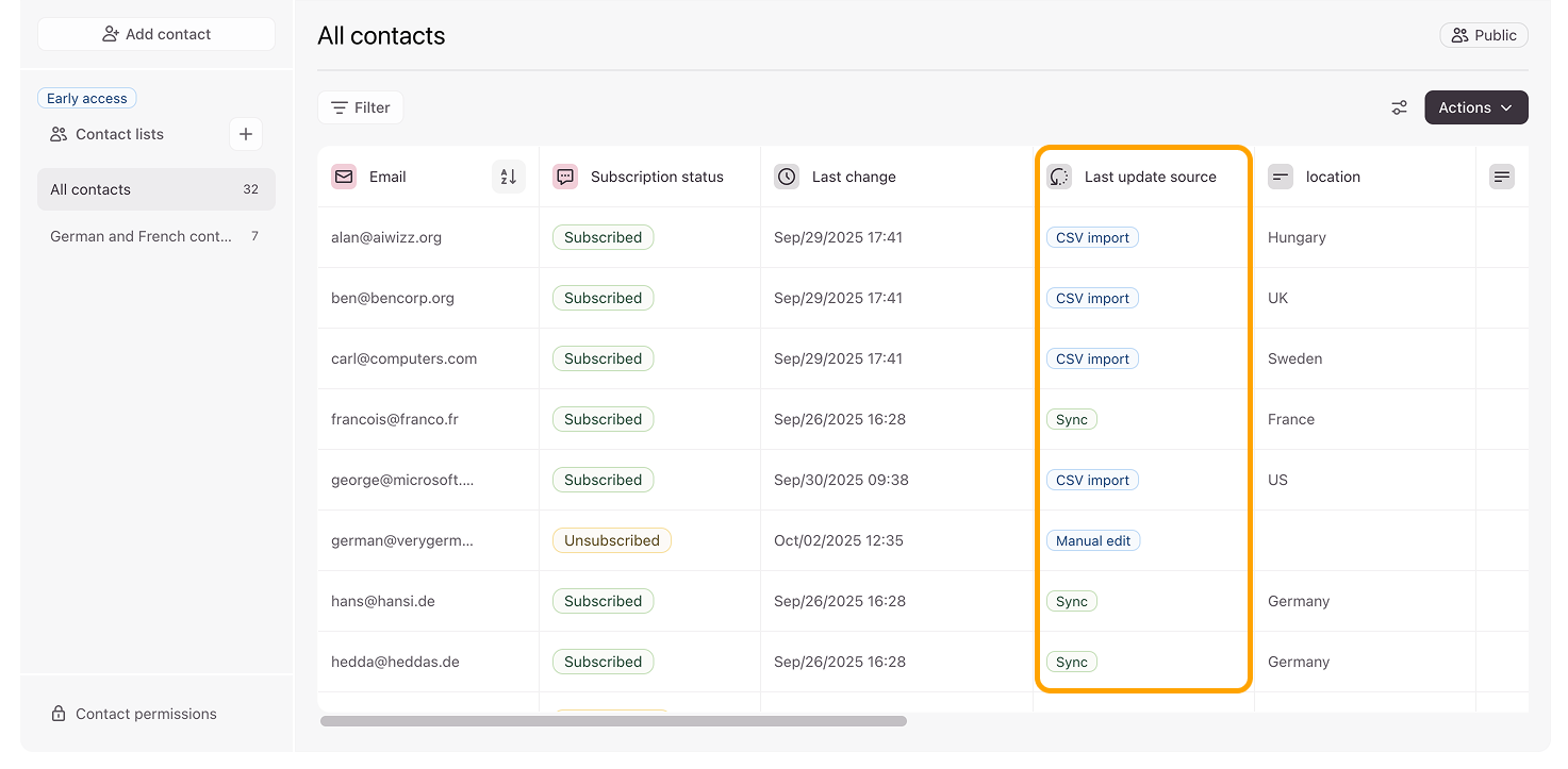 Last update source column showing the source of each contact. The values in this column can be the following: