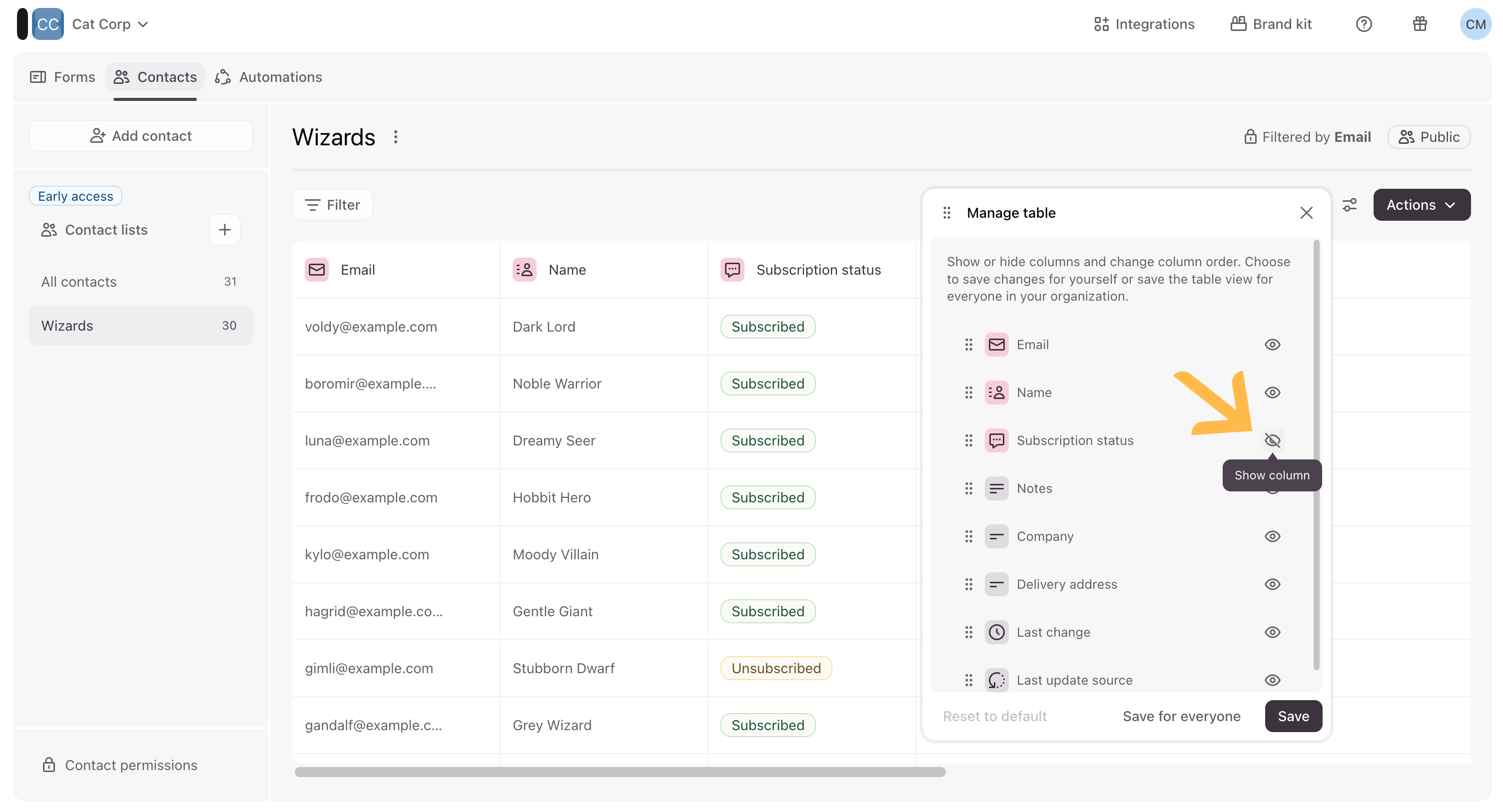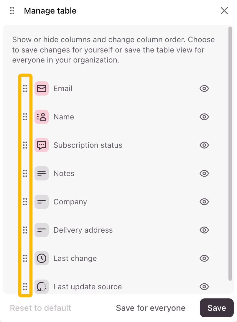 Note that you can’t reorder or show or hide columns in your default contact list. The eye icon next to the name of each column will be greyed out in the default contact list. Learn more about Contact permissions here.