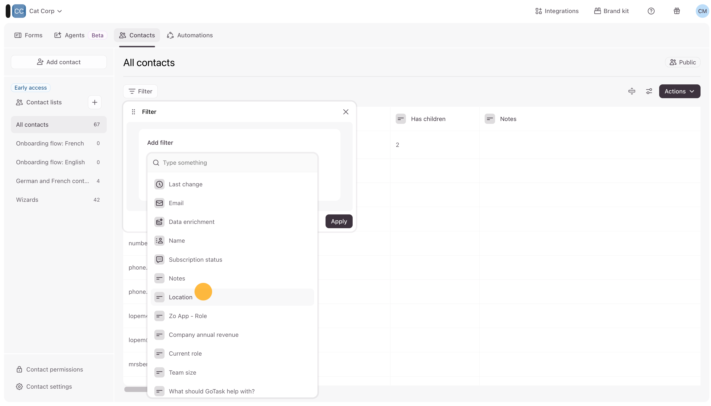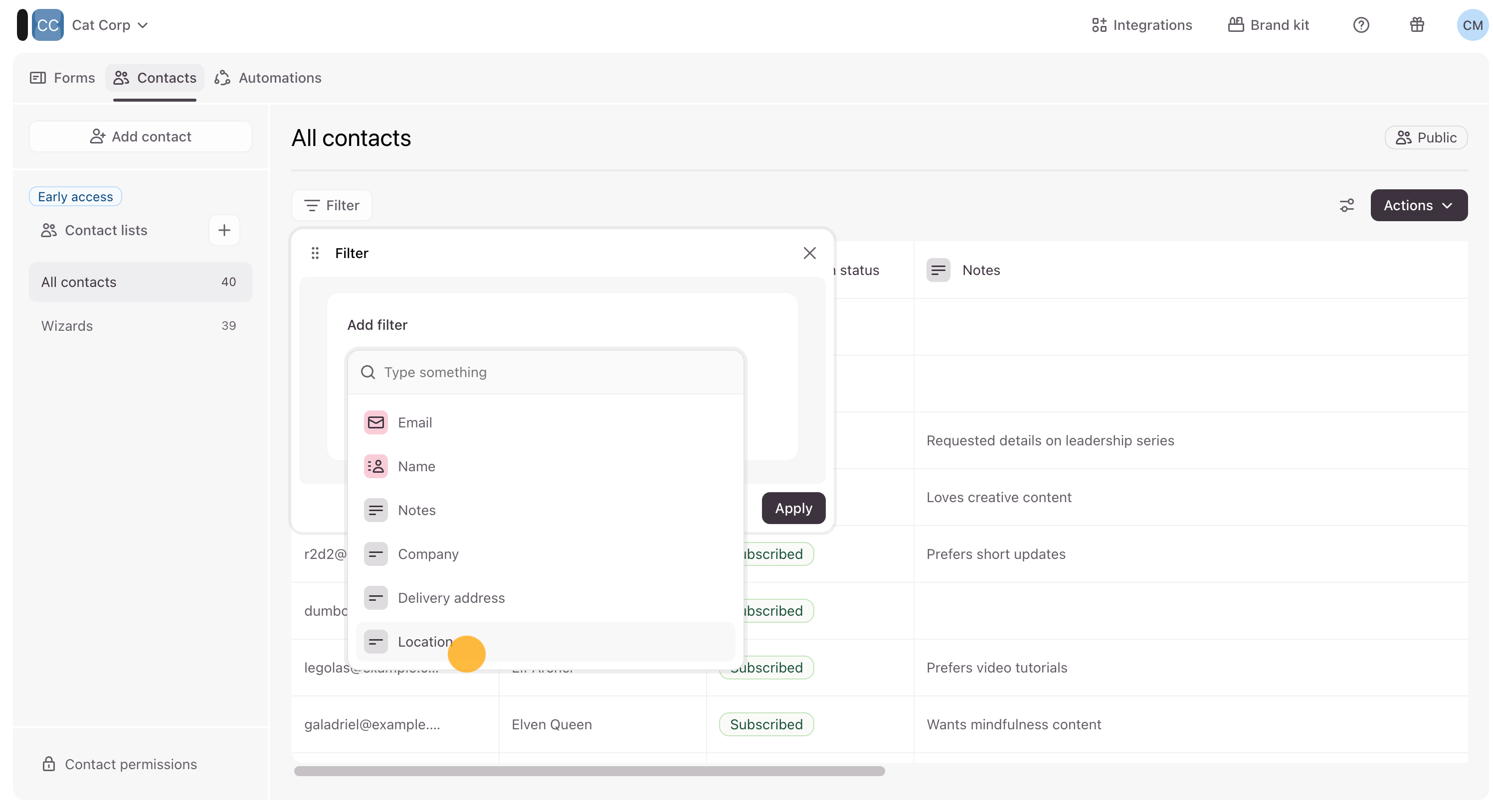 You can use filters to search for contacts based on contact property information, like a contact’s location or their lead status.