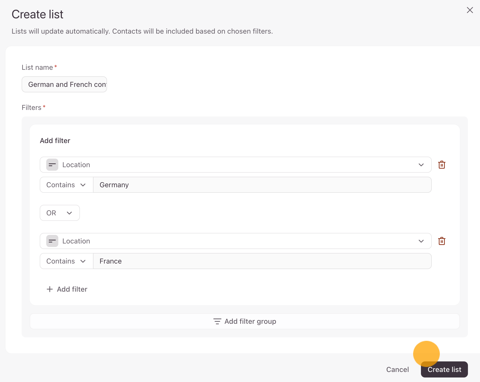 - Enter the name of your new Contact list in the List name field, and adjust your filters, if needed. Click Create list when you’re done with your selection.