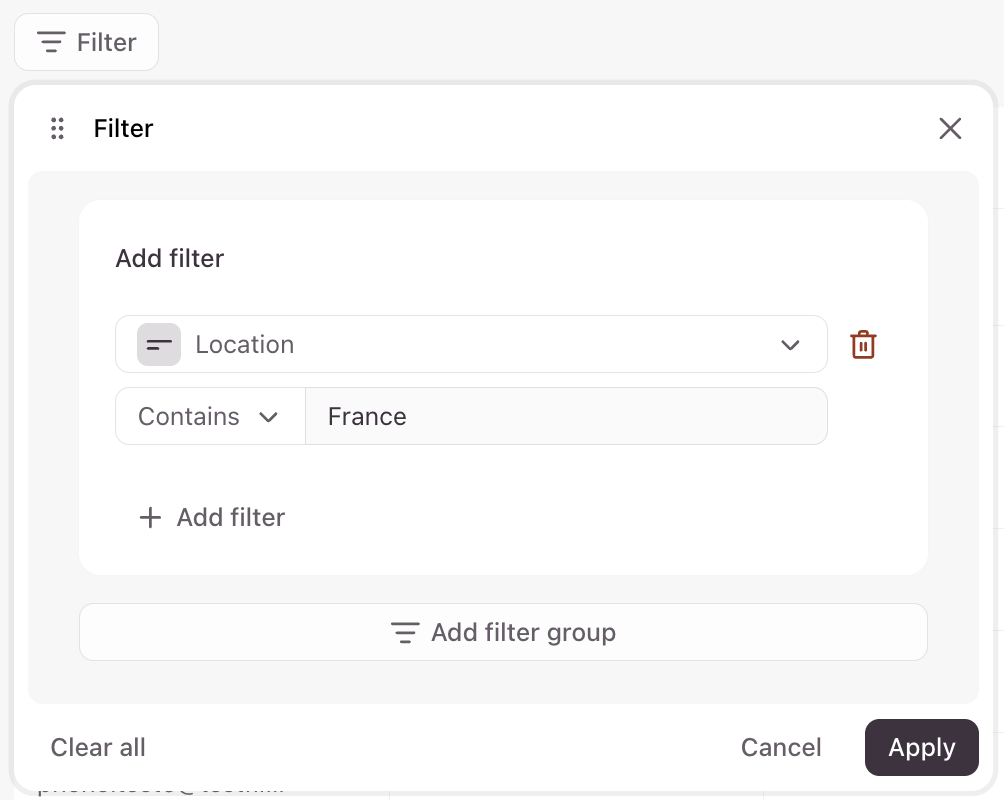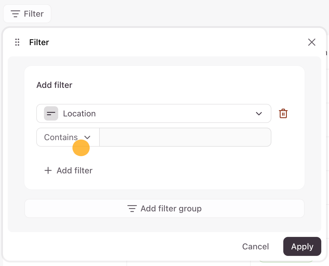 You can also click Add filter group to create another filter group. Select AND/OR operators here, or click the trashcan icon to delete a filter, or Delete group to delete a filter group. Click Apply when you’re done with your selection.