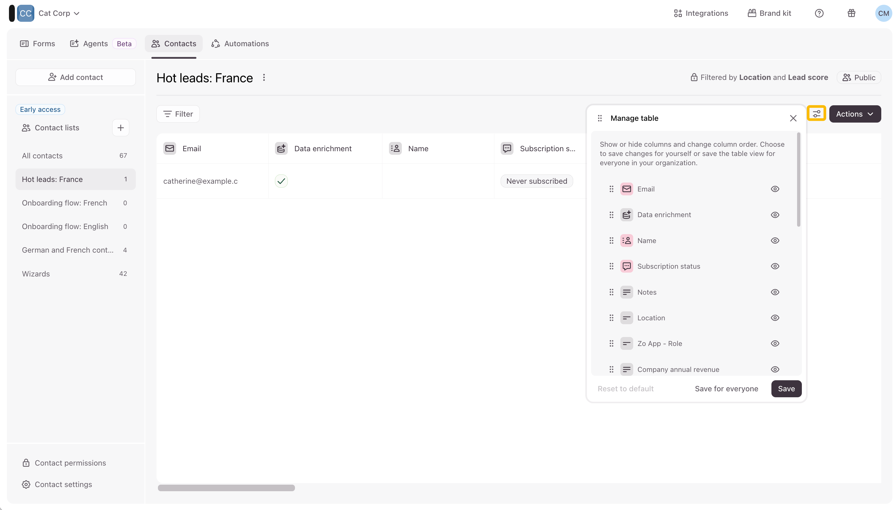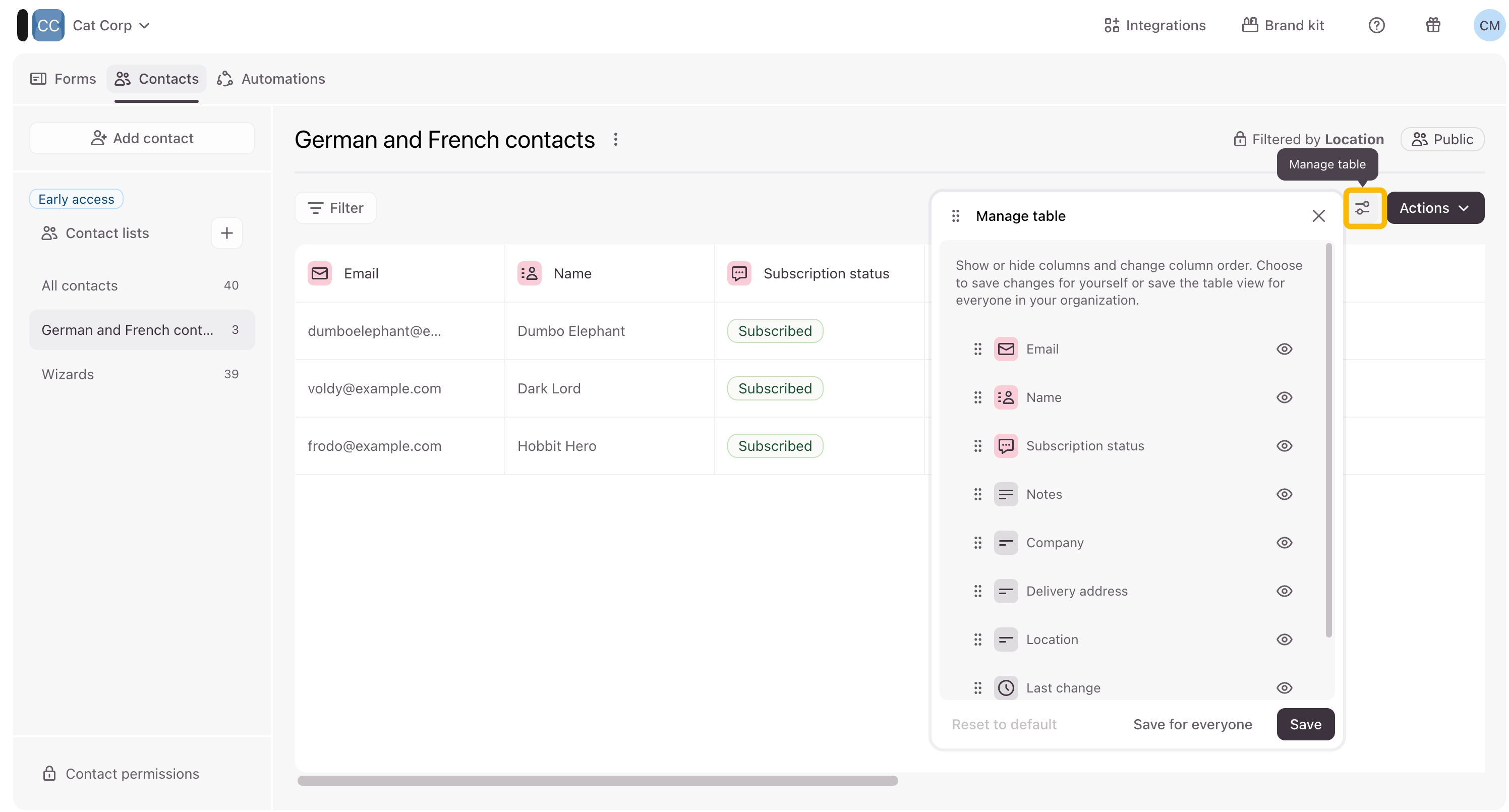 You can click the Manage table icon to sort and reorder your contacts table, and save your selection for yourself, or everyone in your organization.