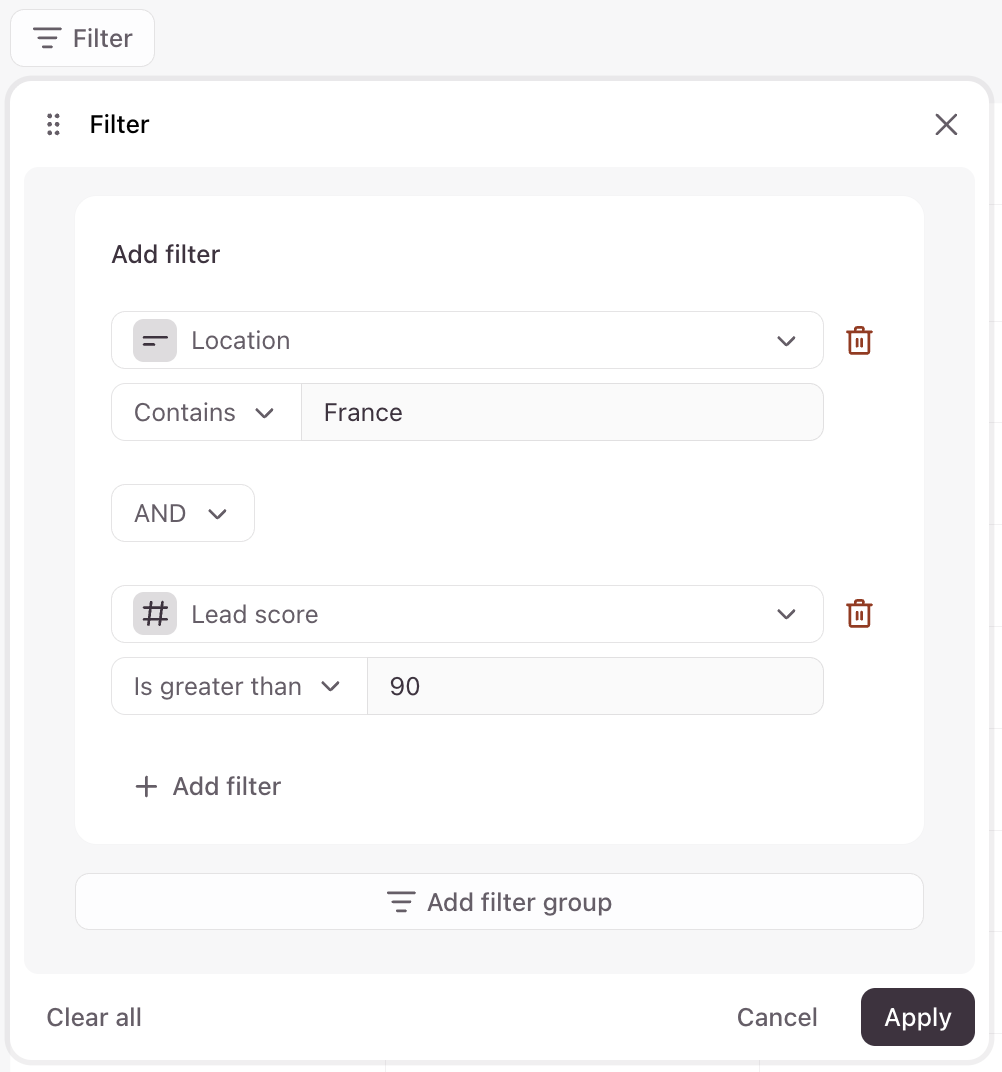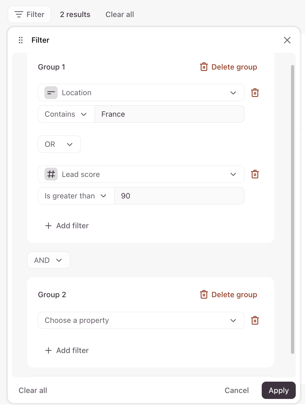 8. Select the property you want to filter by. In this example, we’re filtering for contacts who are located in France AND have a lead score above 90. If you choose the OR filter instead, the results will include contacts who are located in France OR have a lead score above 90.