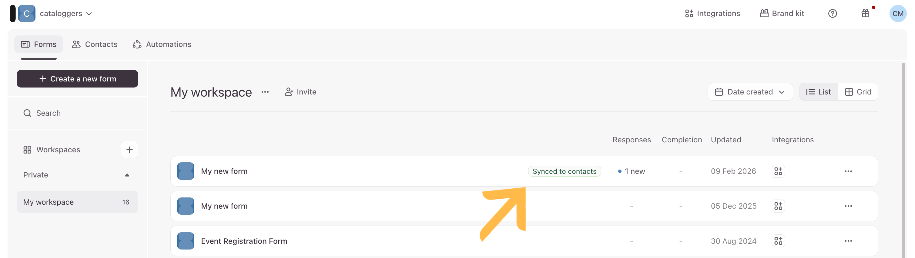 Once your form is mapped and published, forms that are synced to Contacts will show a Synced to contacts label in the Forms tab of your Workspace, so you can quickly confirm that responses are flowing into Contacts