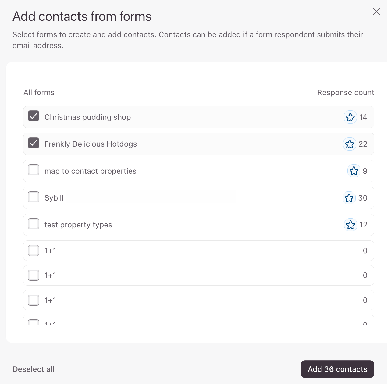 This opens a modal where you can browse all your forms with their response counts, select multiple forms at once, and bulk-add contacts in a single action (as long as the forms collect an email address). This makes it much faster to populate a new Contacts database when you already have several live forms with responses.
