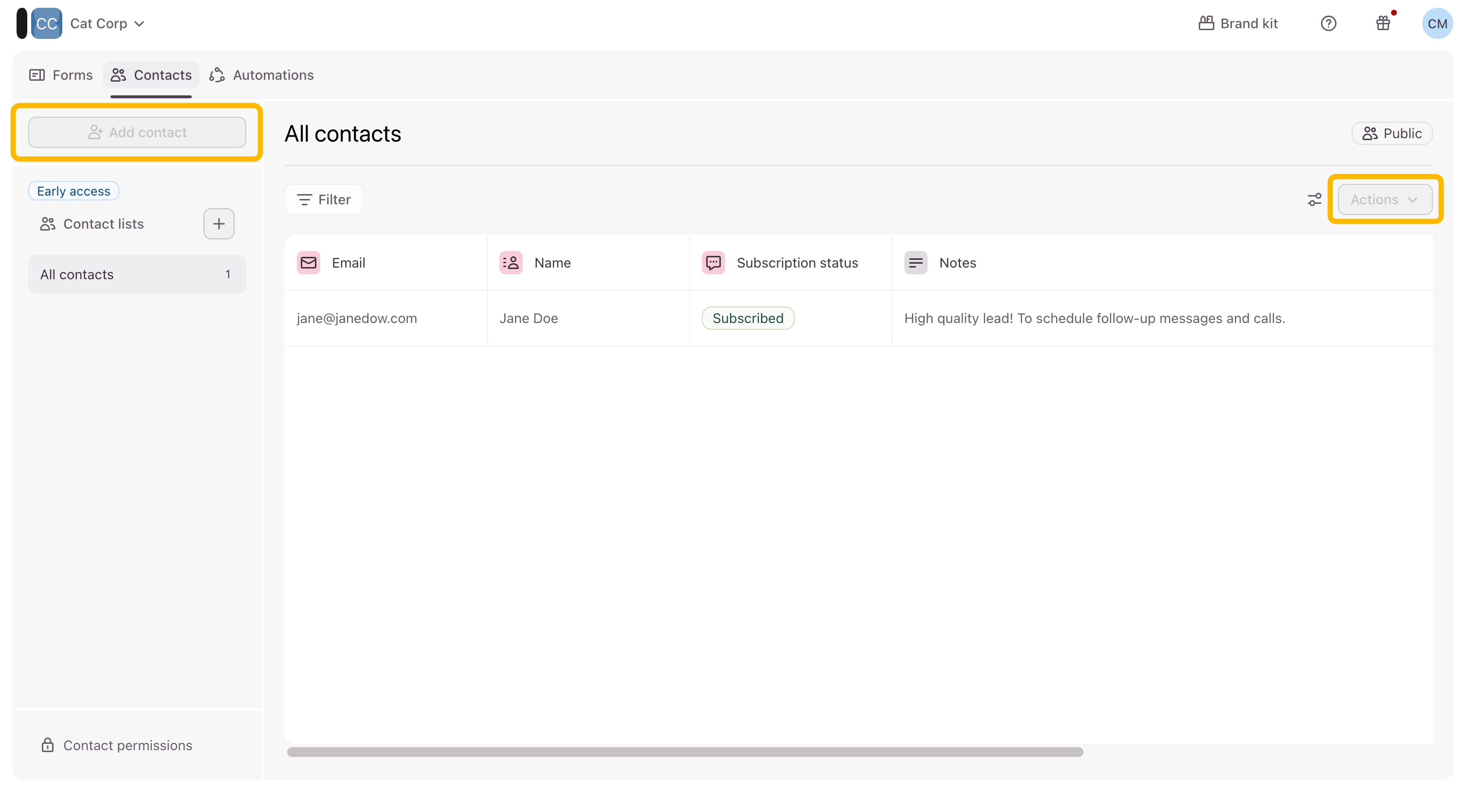 Organization members with Viewer permissions won’t be able to add Contacts and perform other actions in your Contact lists. The Actions and Add contact buttons will be grayed out for them, as seen in the screenshot below.
