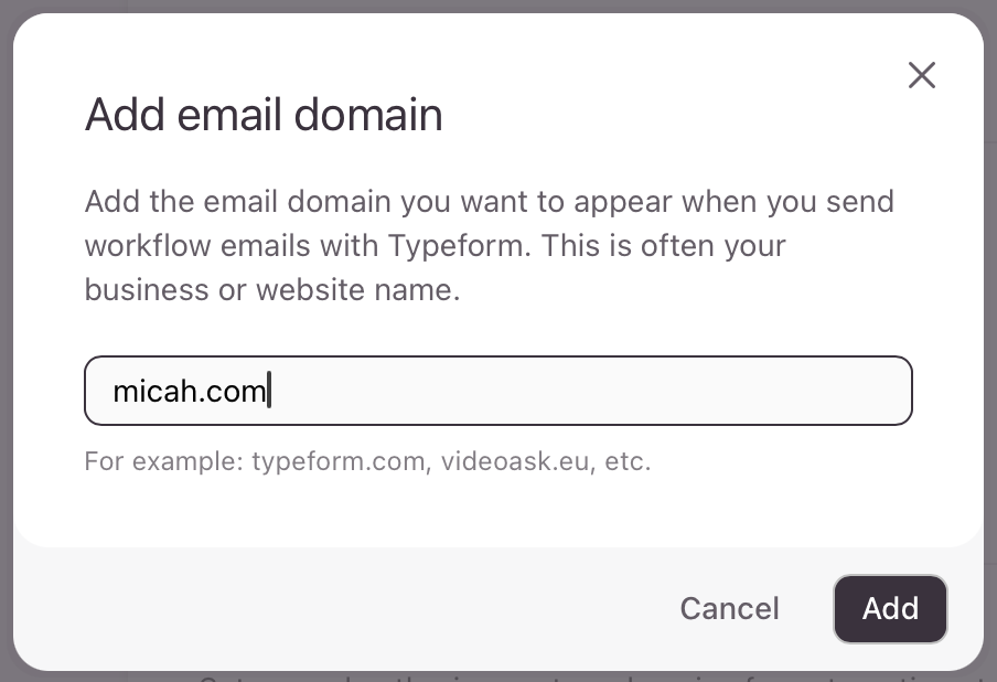 2. A new popup will appear, where you can enter your email domain. This isn't your email address, just the domain, like typeform.com or micah.cat. Now click Add, and wait without clicking anything more.