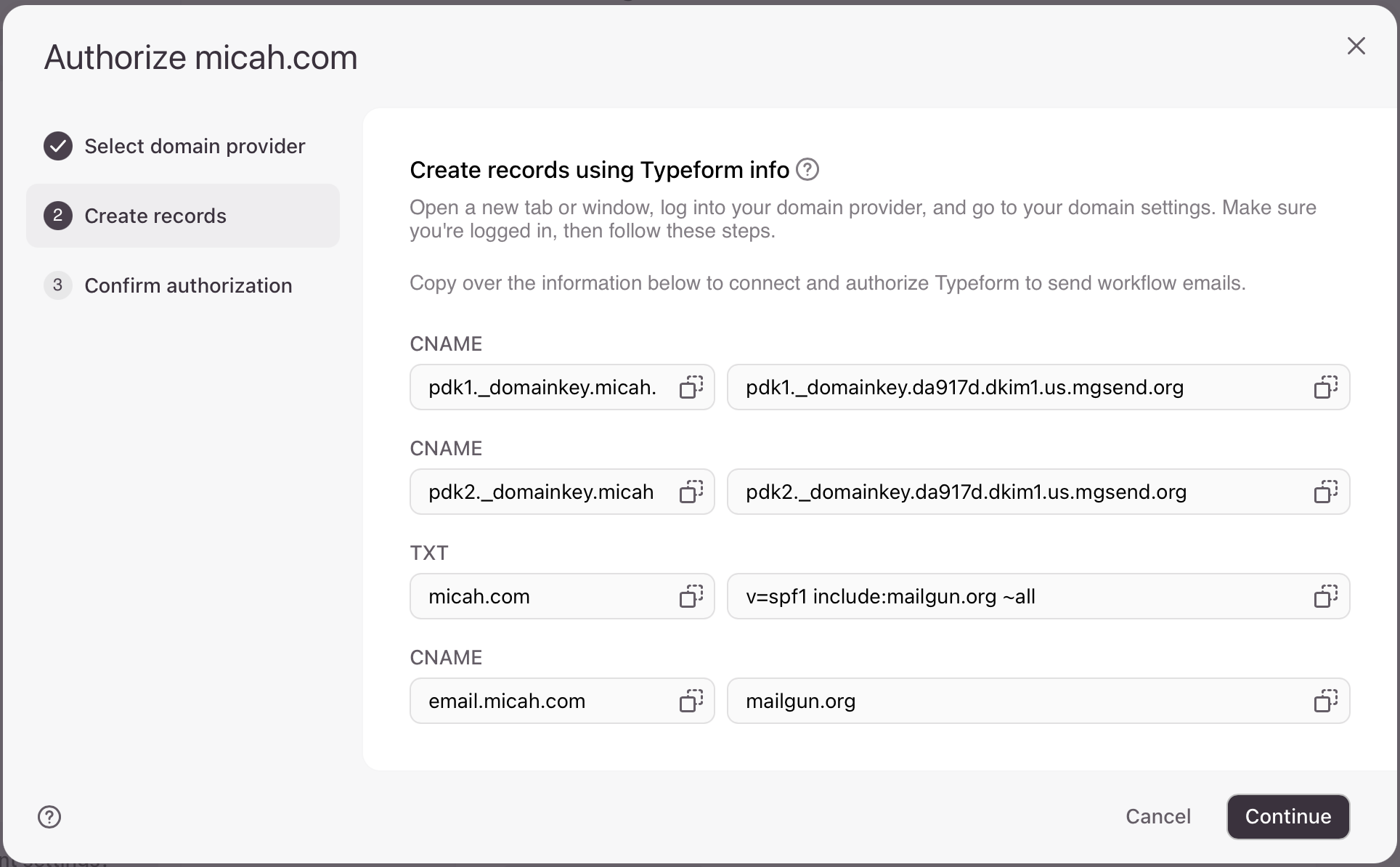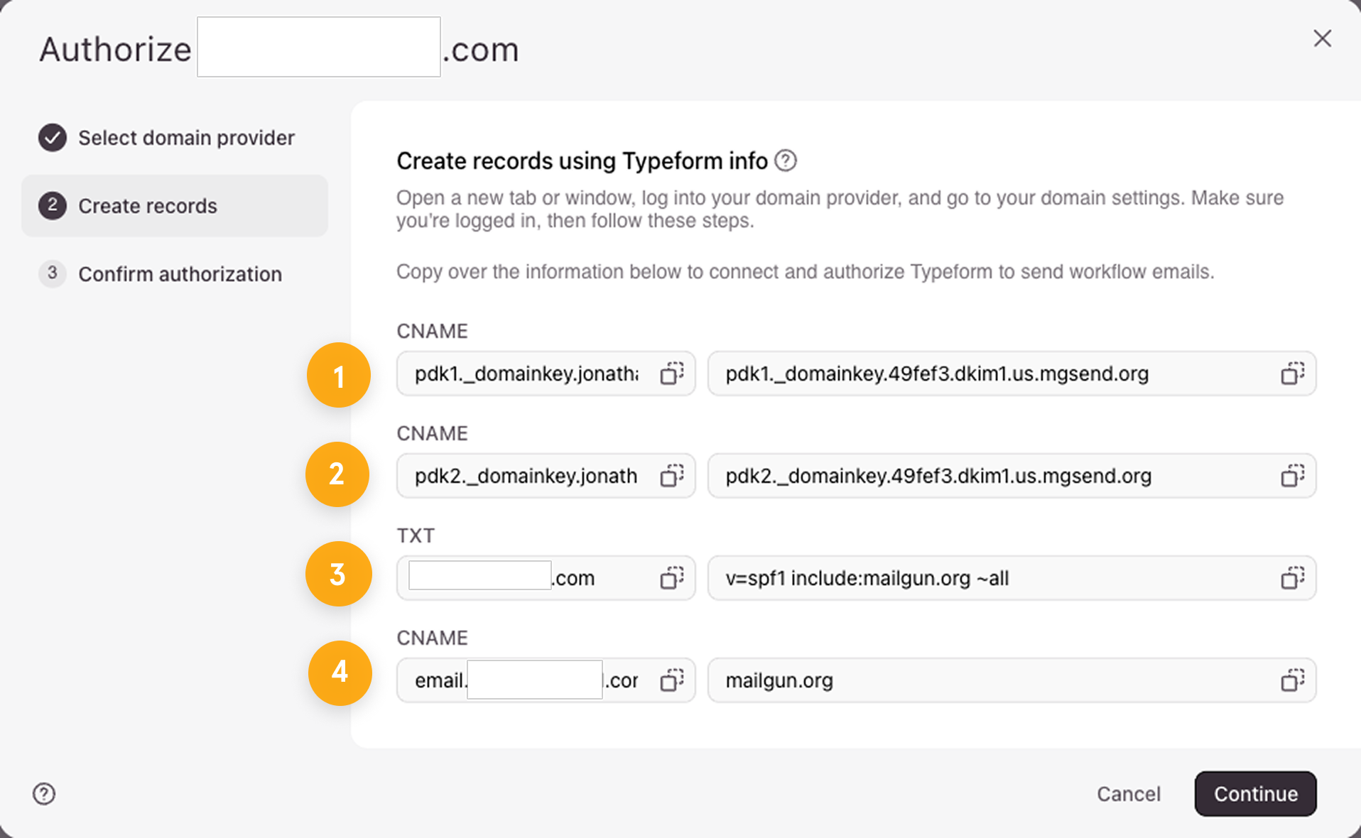 If you are failing to get your domain authorized in Typeform, make the following changes to the data provided from your Typeform account
