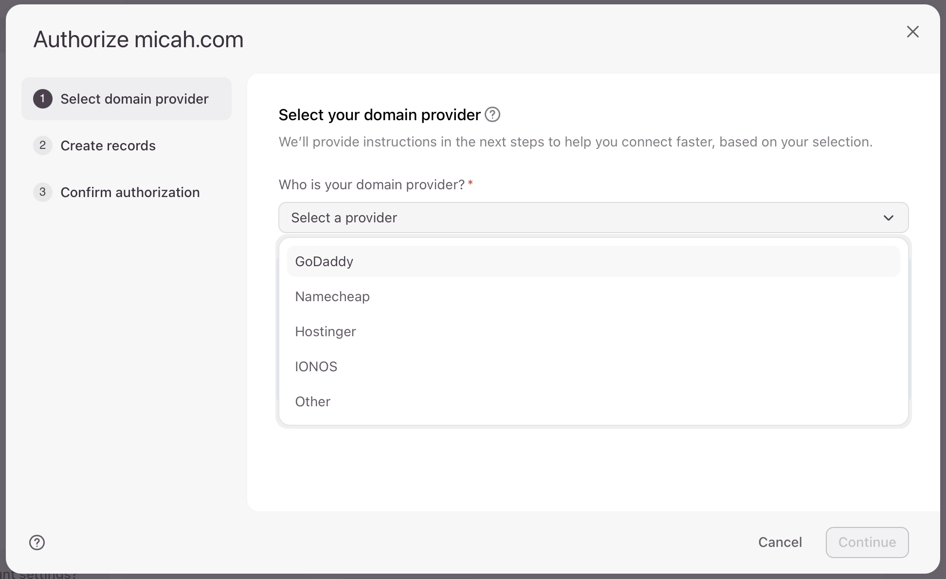 If your domain provider is not on the list, click Other. Once you've chosen, click Continue.