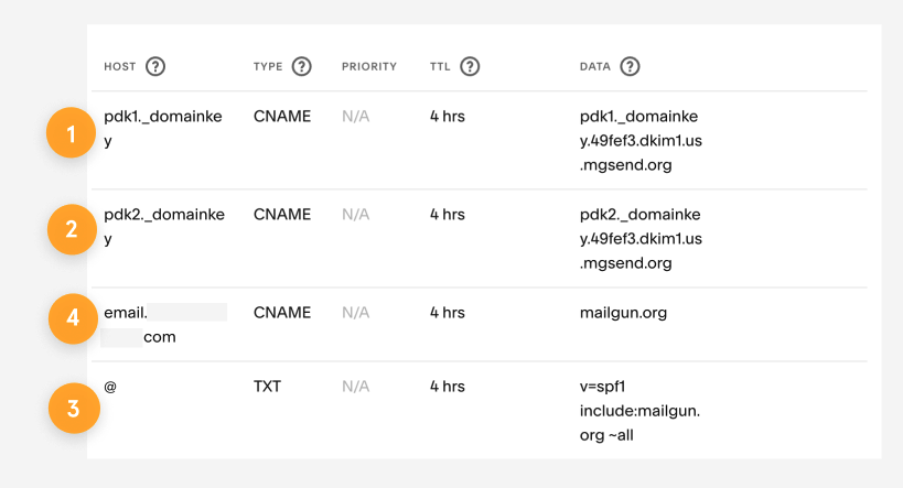 Each of these values will need to be copied into a new DNS record in your domain provider, for the domain you are using.