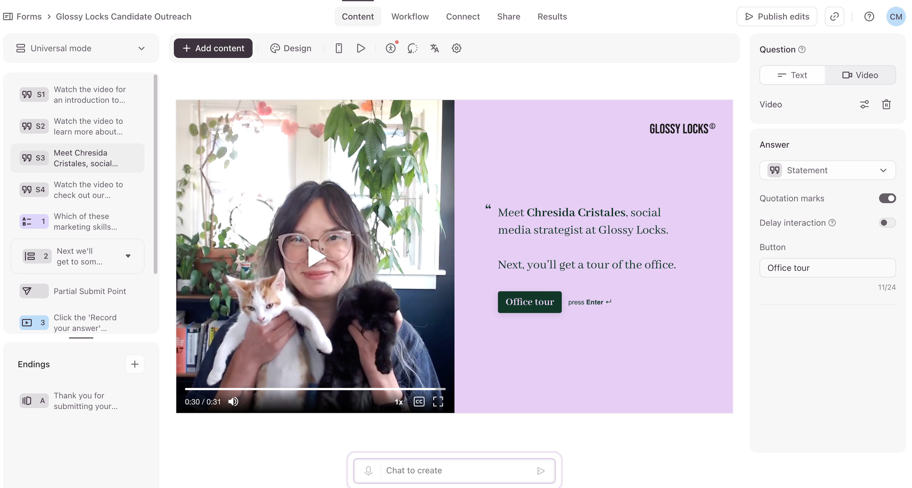 We recommend using the Statement question type with a video question for your introduction. You can also customize the button text that appears alongside the video with a clear call-to-action, like "Apply now!", or, "Let’s get started!"