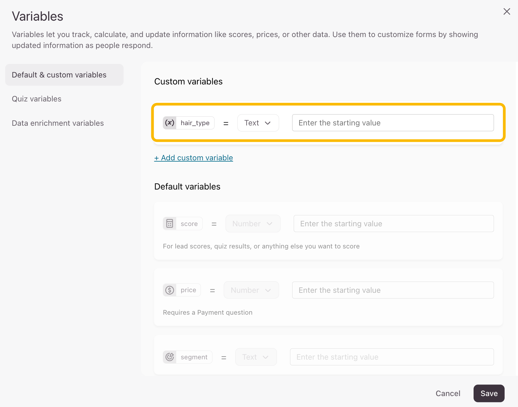 7. Type in the variable name you want to use and in the dropdown select if you want to use a number or text variable. We’ve added a hair_type text variable. Click Save when you’re done.