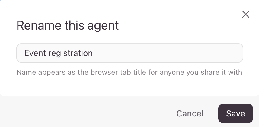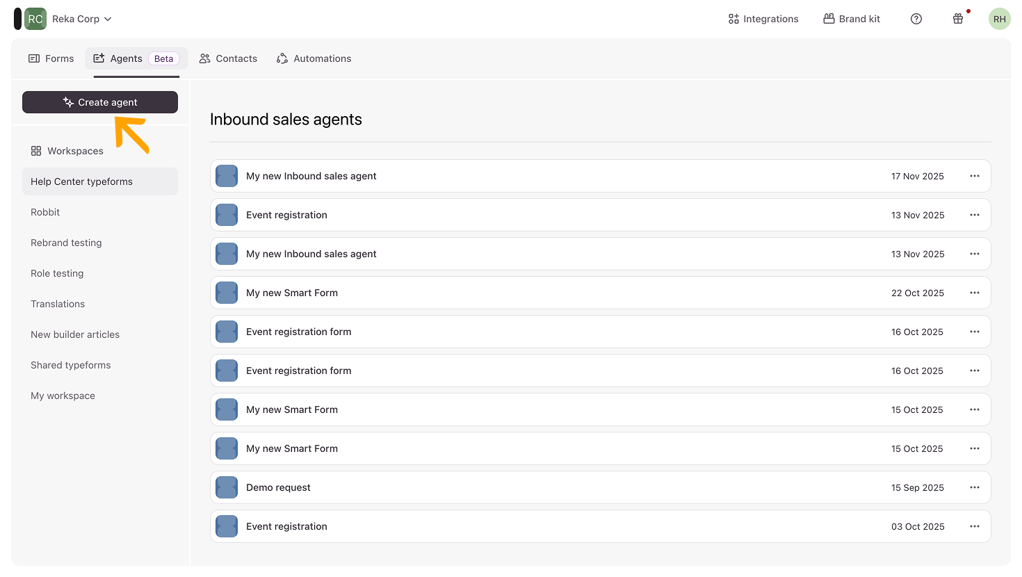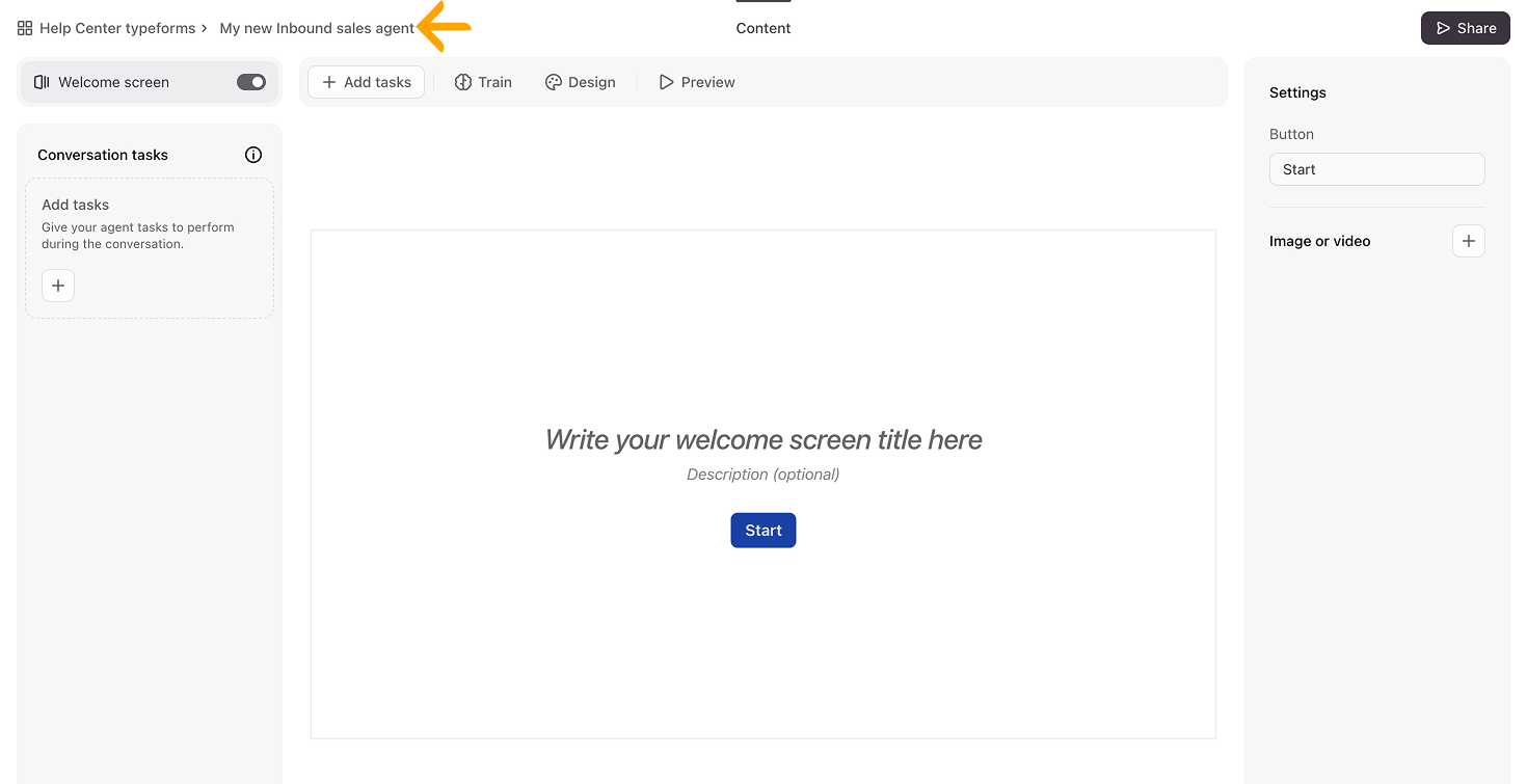 - You can also customize your inbound sales agent by giving it a name that will make the form easy to identify. To edit the name of your agent, click the default name next to the name of its workspace in the top left corner.
