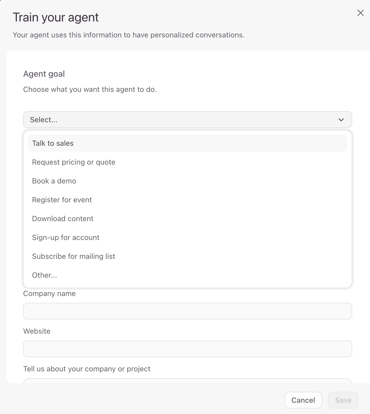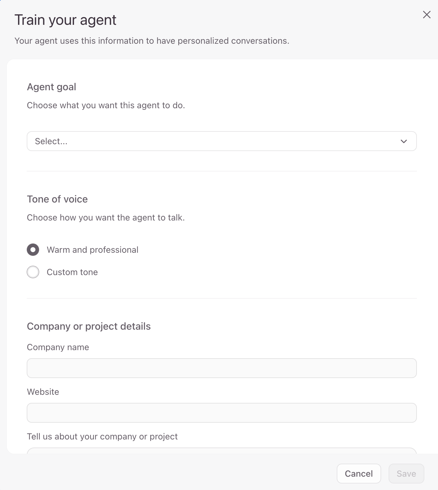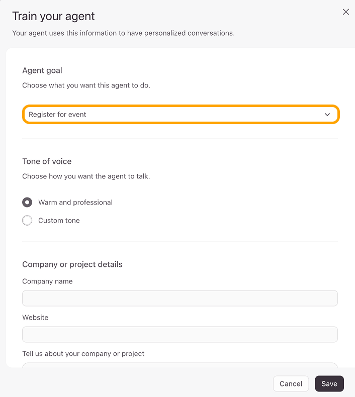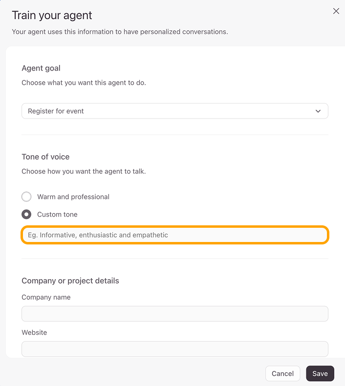 - Now you can start training the agent by giving it some context about your project and company to personalize the conversation. Here’s where you can provide the AI with an identity and mission to make sure that the conversations generated are personalized and effective.