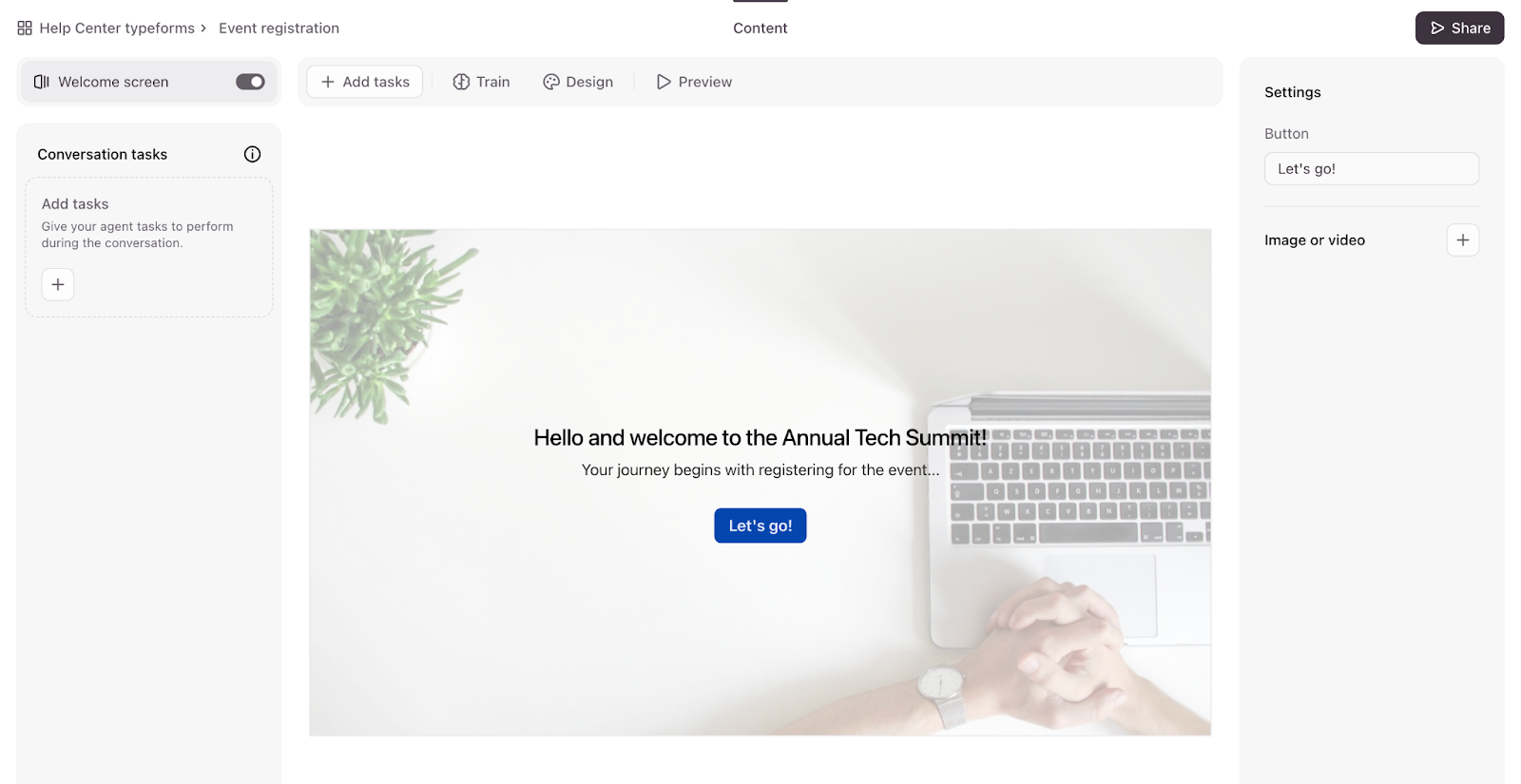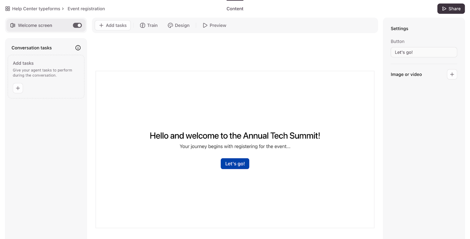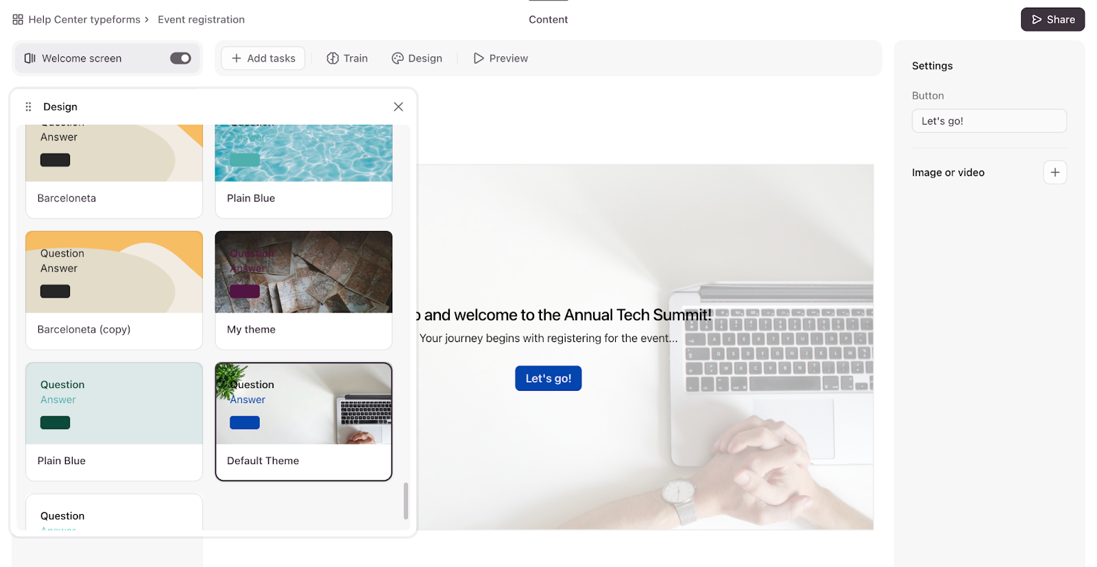 - Under Settings, you can customize the button text with up to 24 characters, and you can also add an image or video to the Welcome Screen. You can also click Design to select a theme for your agent, just like you would with a regular form.