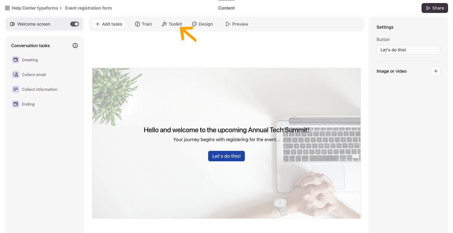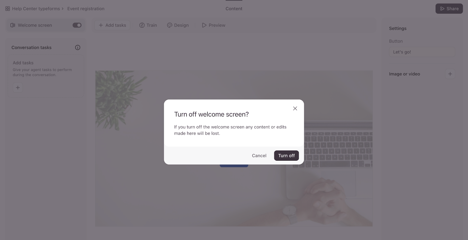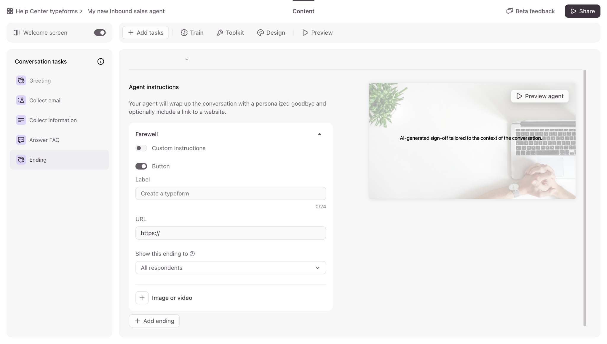 - Under Settings, you can customize the button text with up to 24 characters, and you can also add an image or video to the Welcome Screen. You can also click Design to select a theme for your agent, just like you would with a regular form.