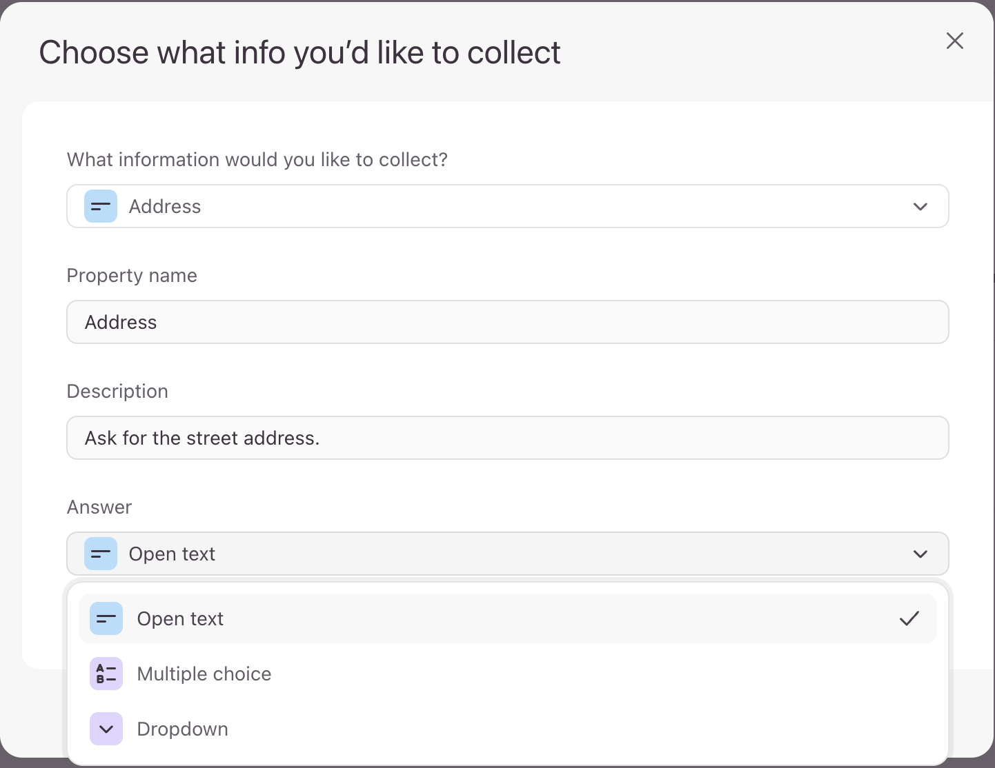 - You can then give your property a name, add a description to it, and select the answer type you want to map it to in your form. You can currently map to Open text, Multiple choice and Dropdown answers. Learn more about question types in Typeform here.