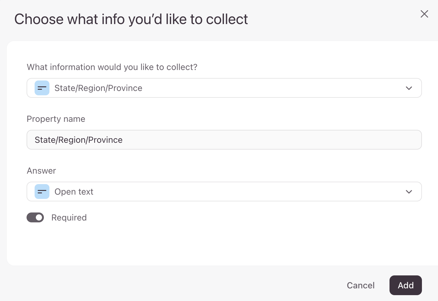 If you’ve selected Multiple choice as your answer type, you can also toggle the Multiple selection switch in addition to making the property required. This will allow people to select multiple options if it applies to them. Click Add when you’re done with setting up your properties.