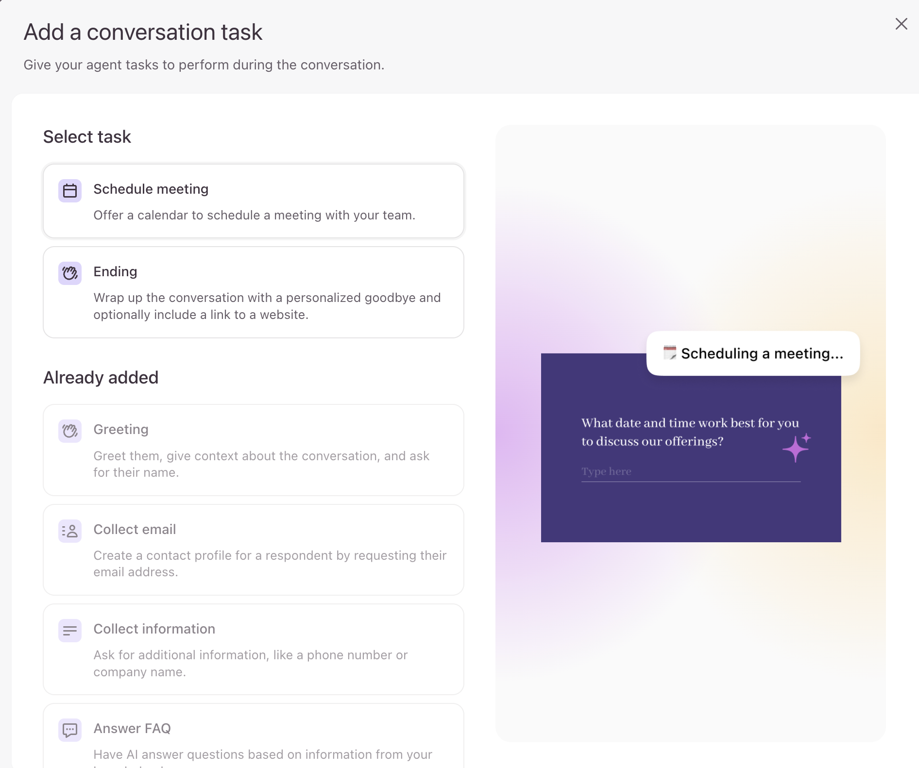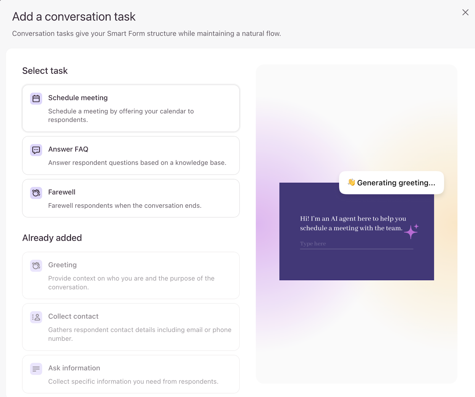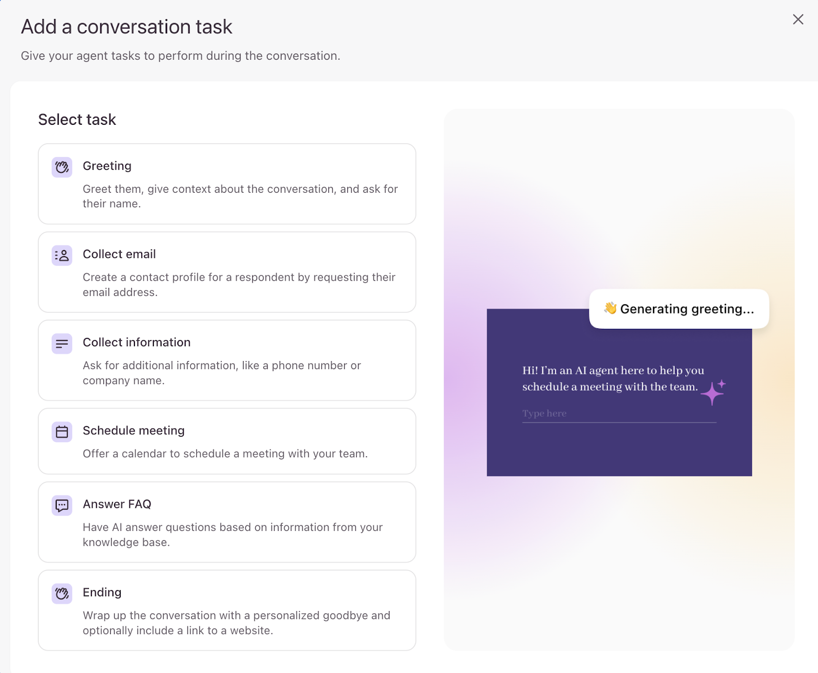 - Now you’ll see the list of available conversation tasks. First, let’s add a Greeting task to initiate the conversation.