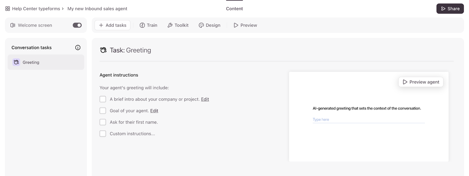 - Now you can customize your greeting task by giving instructions to the agent. Select the checkboxes to include information like context about your company and the goal of the agent. If you haven’t provided this information yet, you can click Edit next to the corresponding row to add or update it.