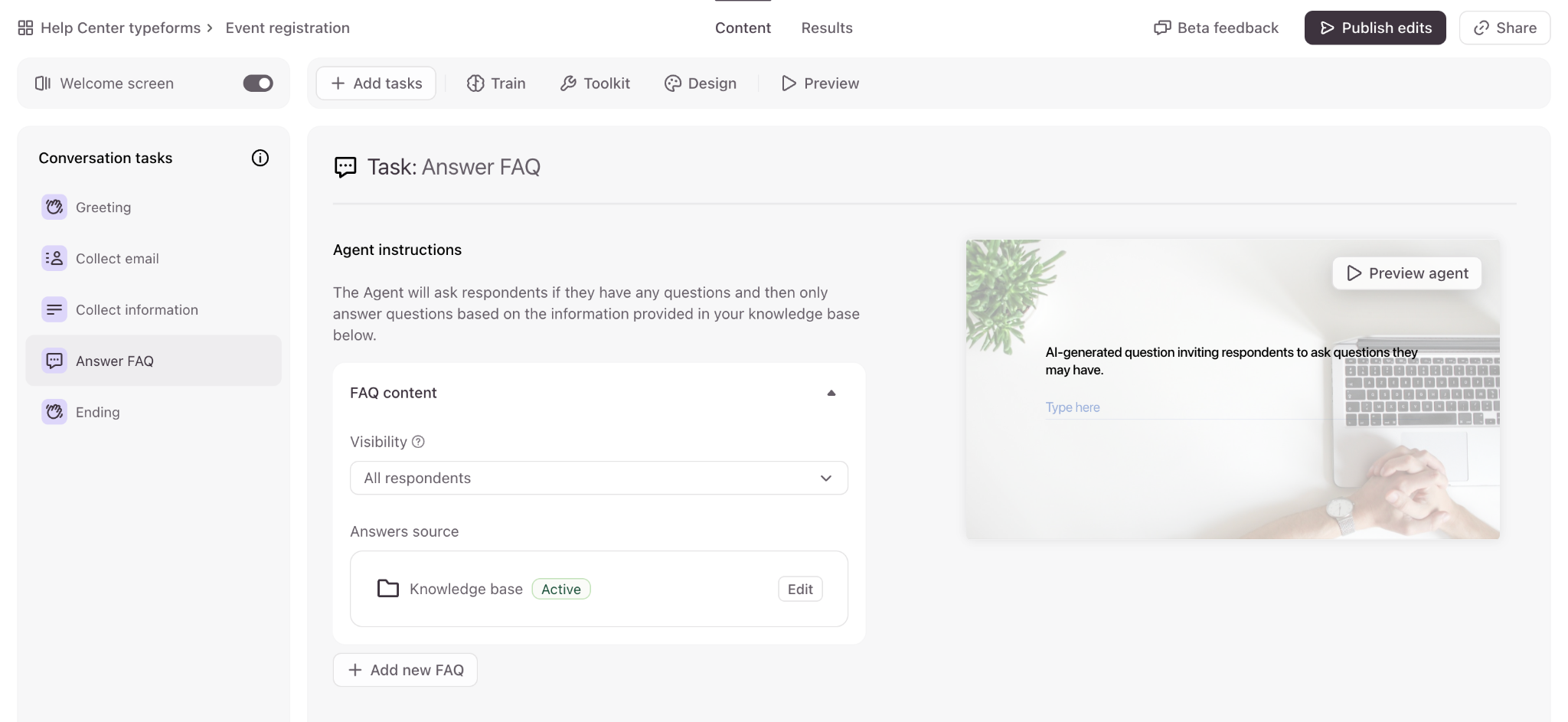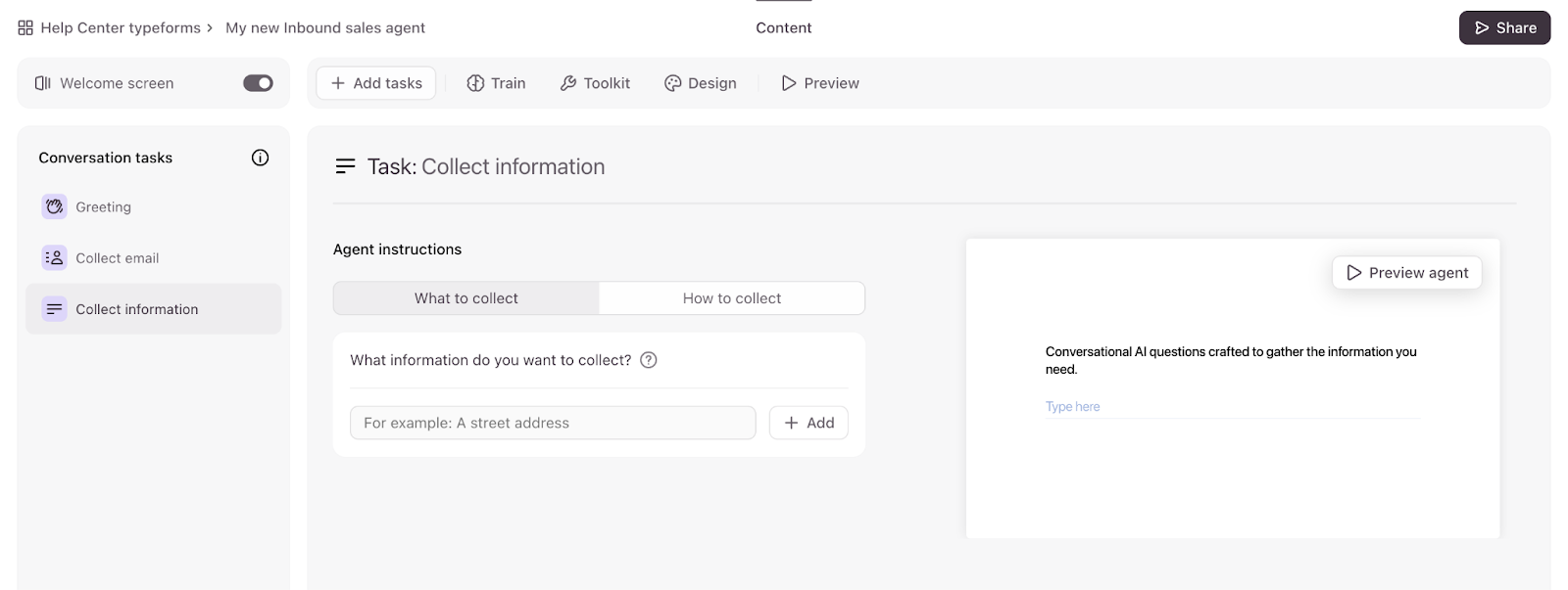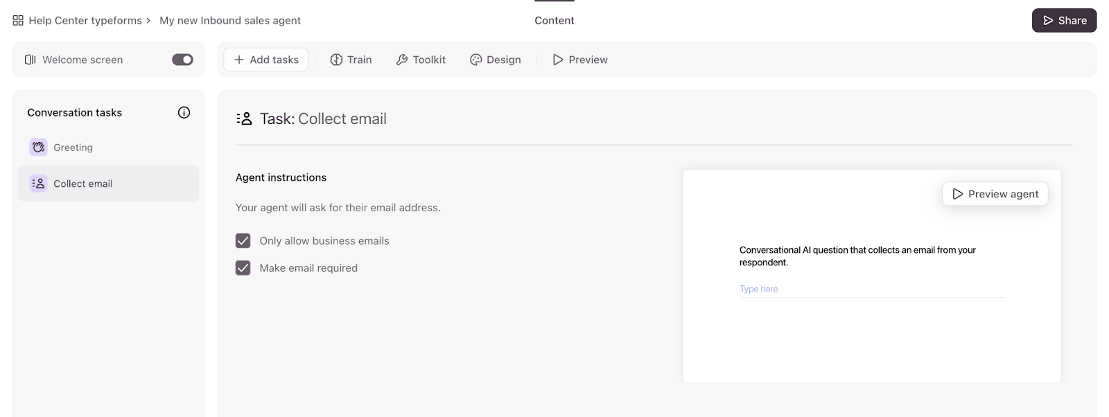 - You can also add a Welcome Screen to your agent to set expectations with your respondents. This screen is not AI-generated, and you can use it to introduce the purpose of your agent to respondents. You can edit the title (up to 1,000 characters), and the description (up to 250 characters) of the Welcome Screen.