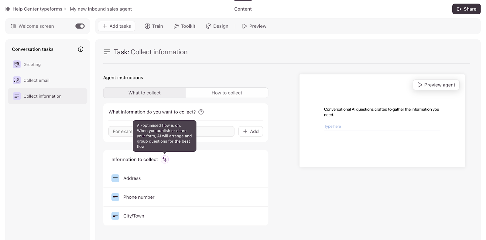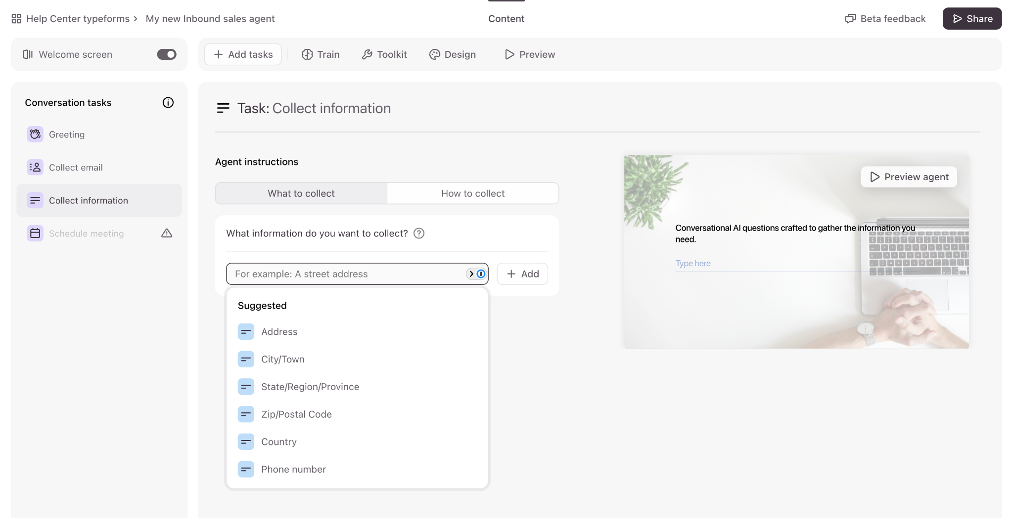 You can create smarter forms with the Inbound Sales Agent by adding tasks to your form to ask for certain information,—for example, collecting contact details, answering FAQs, or scheduling a meeting—and give AI context about your company or project to personalize the conversation. The AI-driven flow creates a more dynamic, two-way dialogue, where the form can adapt to the conversation in real-time to ask relevant follow-up questions to unexpected answers.