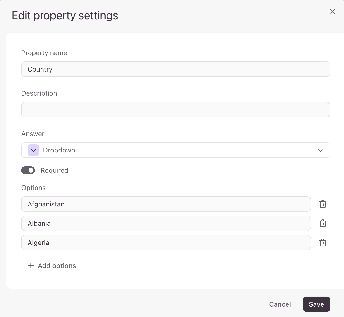 If you’ve selected Dropdown or Multiple choice as your answer type, you can also add your answer options by clicking + Add option, or delete them by clicking the trashcan icon next to each option.