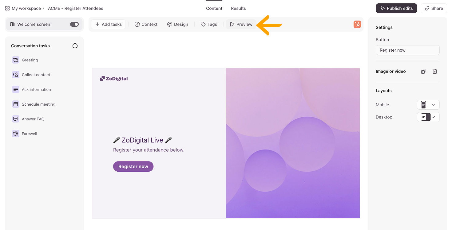 Now that you’ve created your Inbound Sales Agent, it’s time to share it with the world! Click Share or Publish edits in the top right corner to do just that.