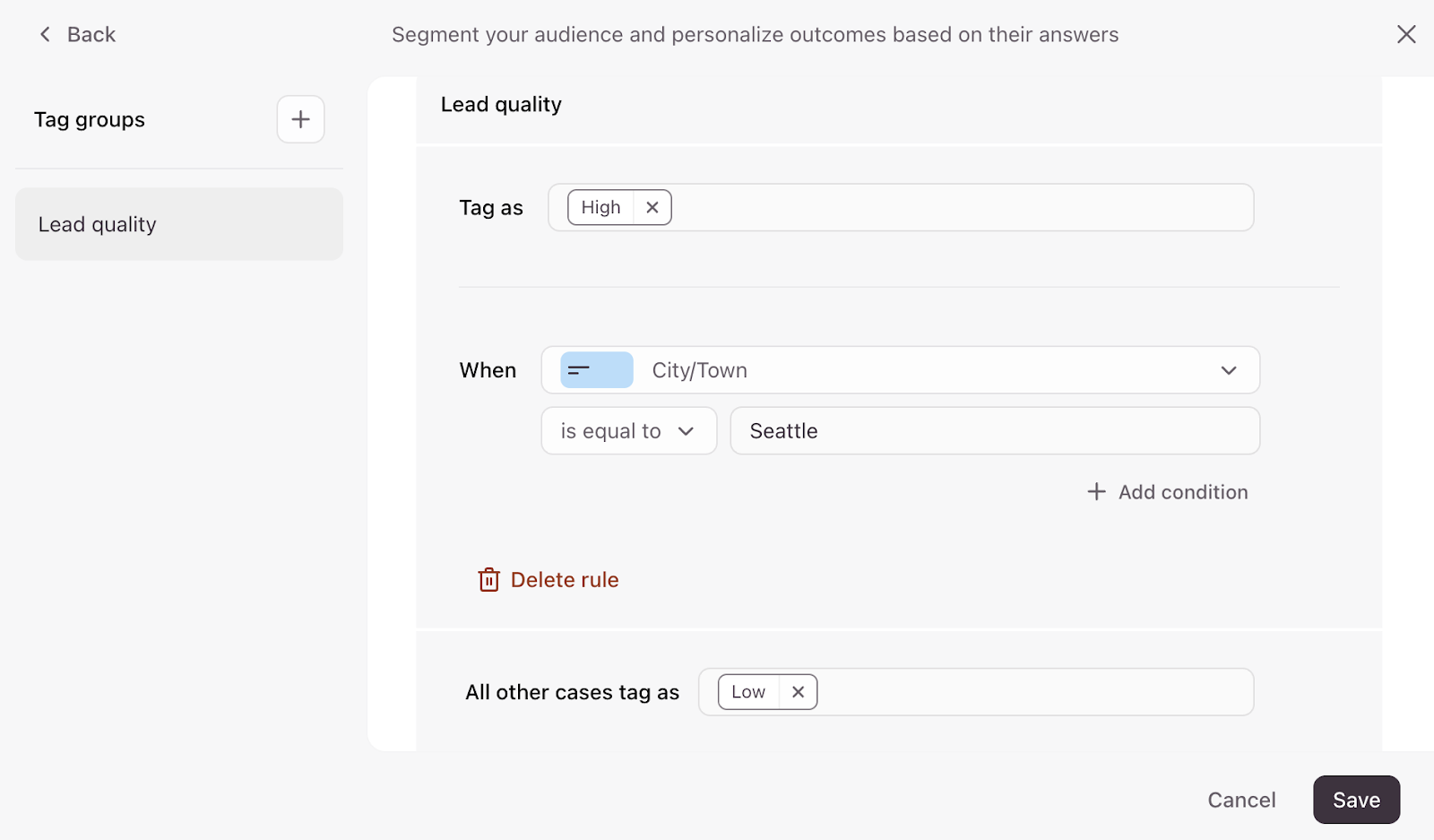 Now you can start adding tagging rules to segment your audience. In the example below, we’re creating a Lead quality tag group and we’re adding conditional tags based on people’s location. When someone responds from the location we’re entered, we’ll tag them as a High quality lead, and when someone responds from a different location, we’ll tag them as Low quality.